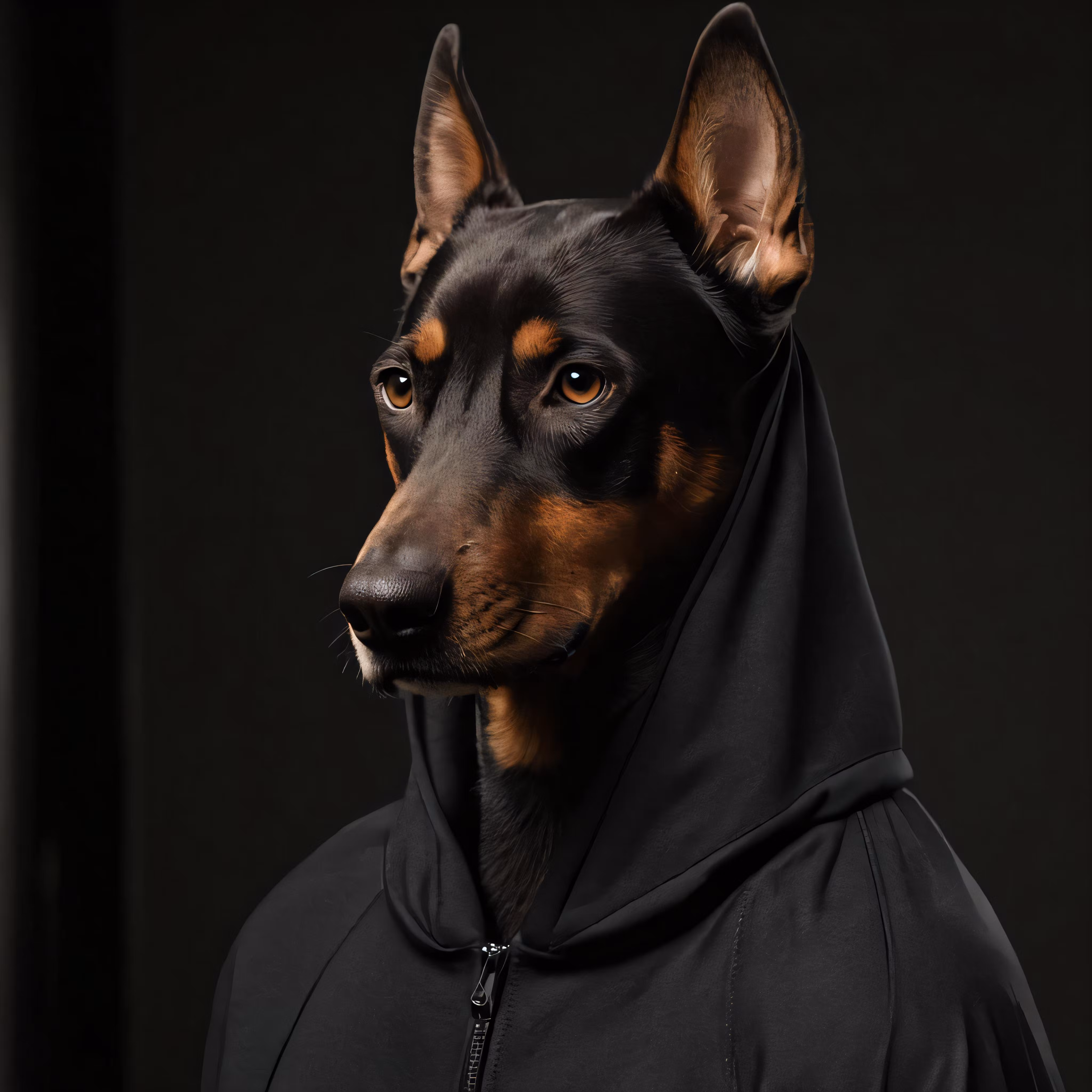 High resolution picture, free to use, a small black and brown dog wearing a hoodie