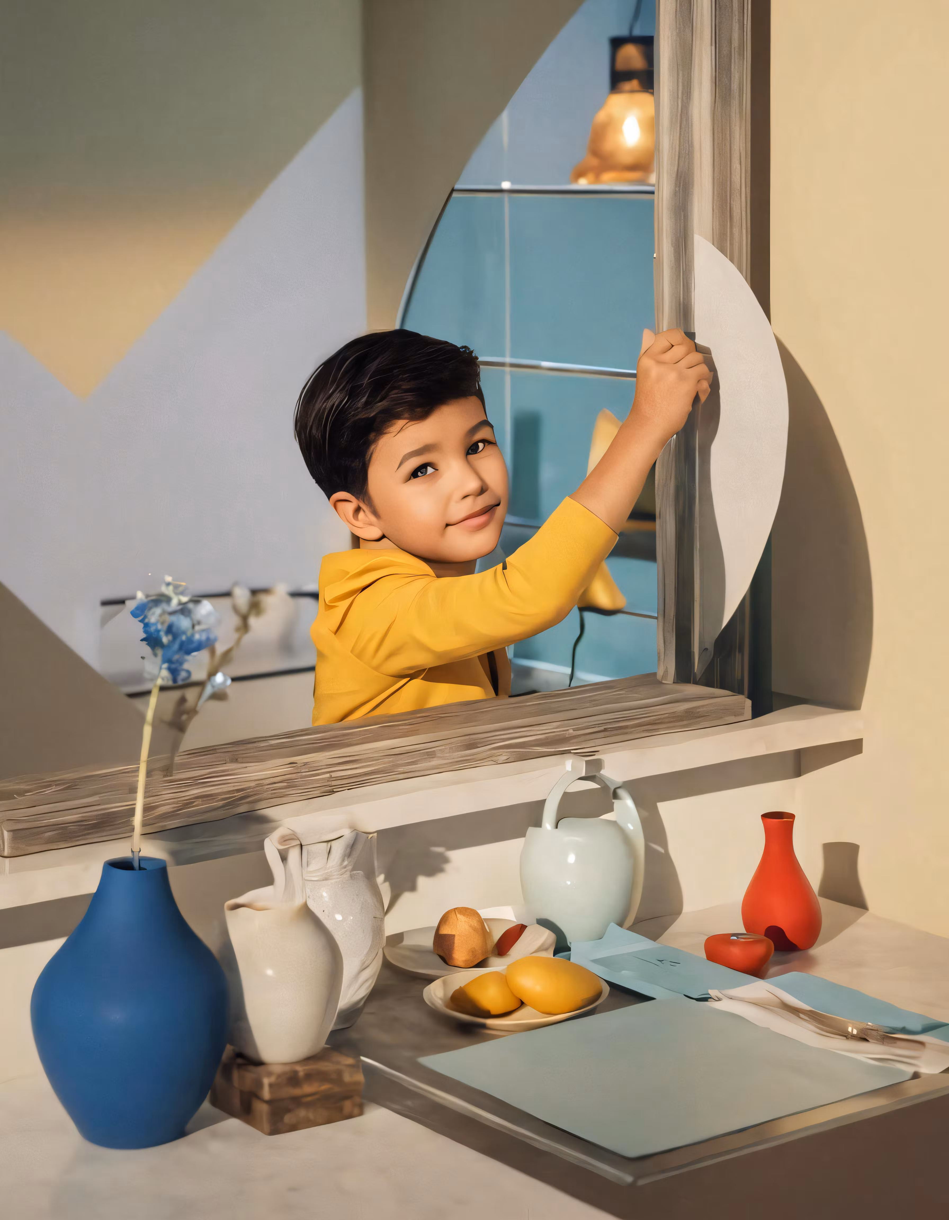 High resolution picture, free to use, a small boy sitting at a counter with two vases on the table
