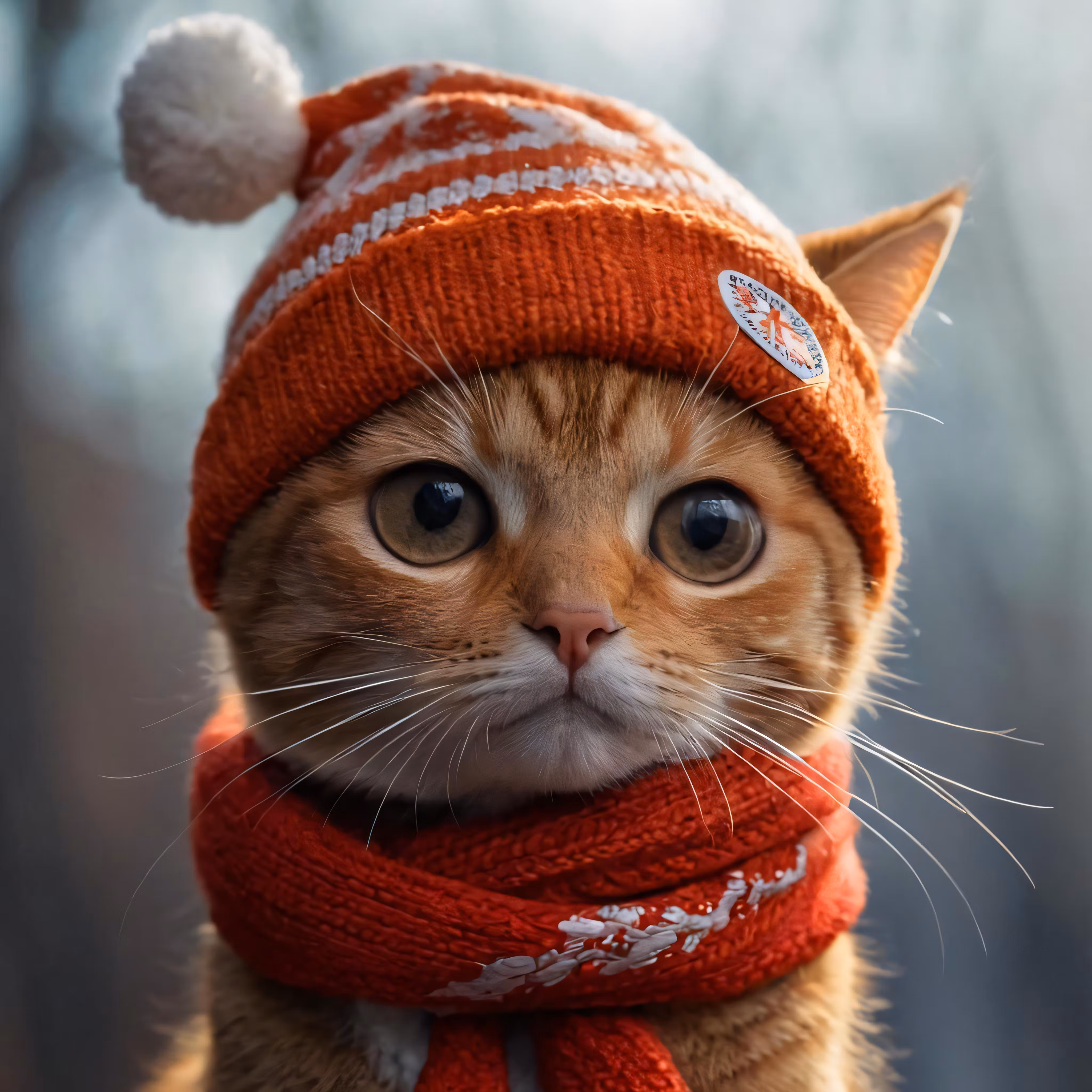 High resolution picture, free to use, a small brown cat wearing an orange winter hat and a knitted scarf