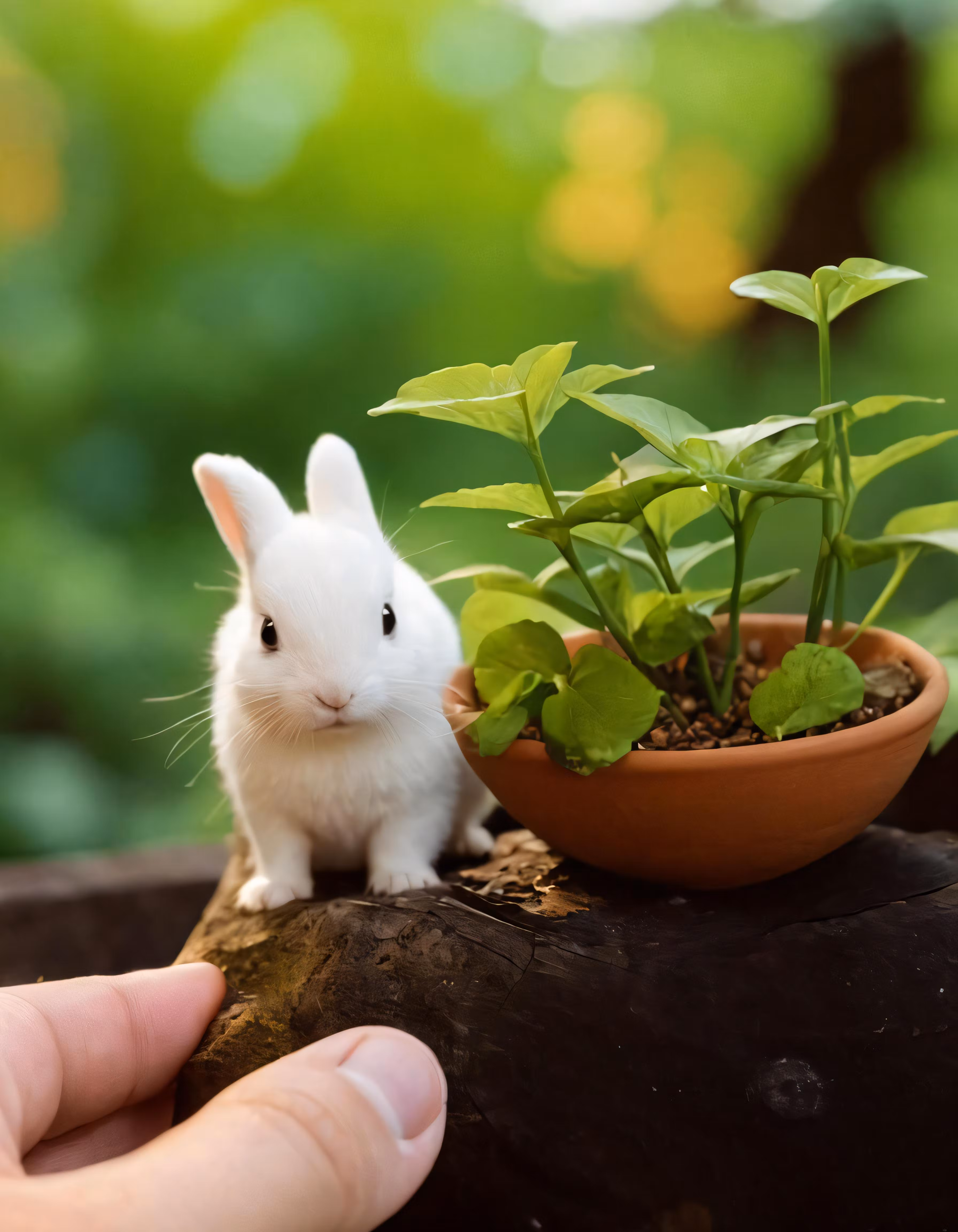 High resolution picture, free to use, a small rabbit that is in front of a potted plant