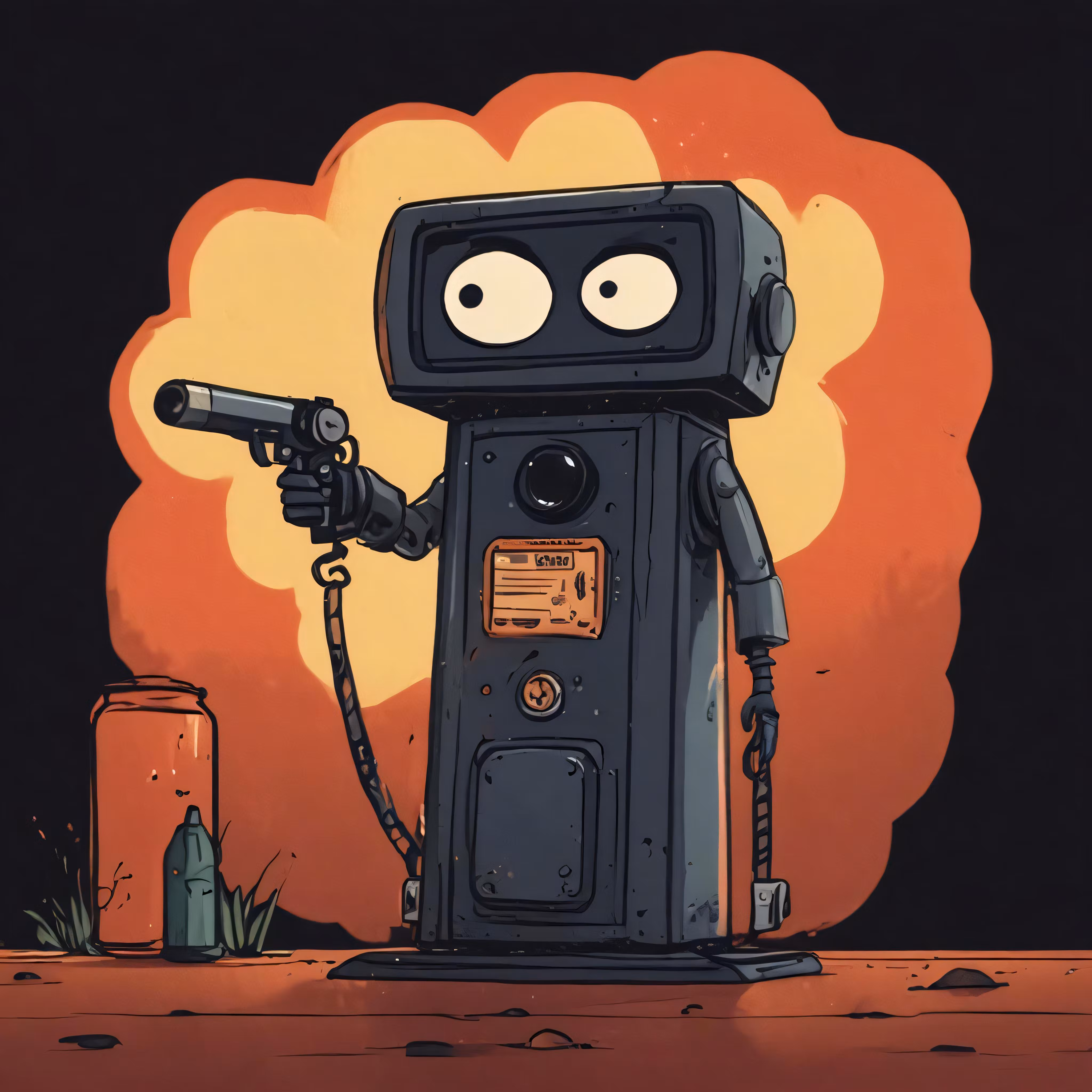 High resolution picture, free to use, a small robot holding a gun standing in front of a building