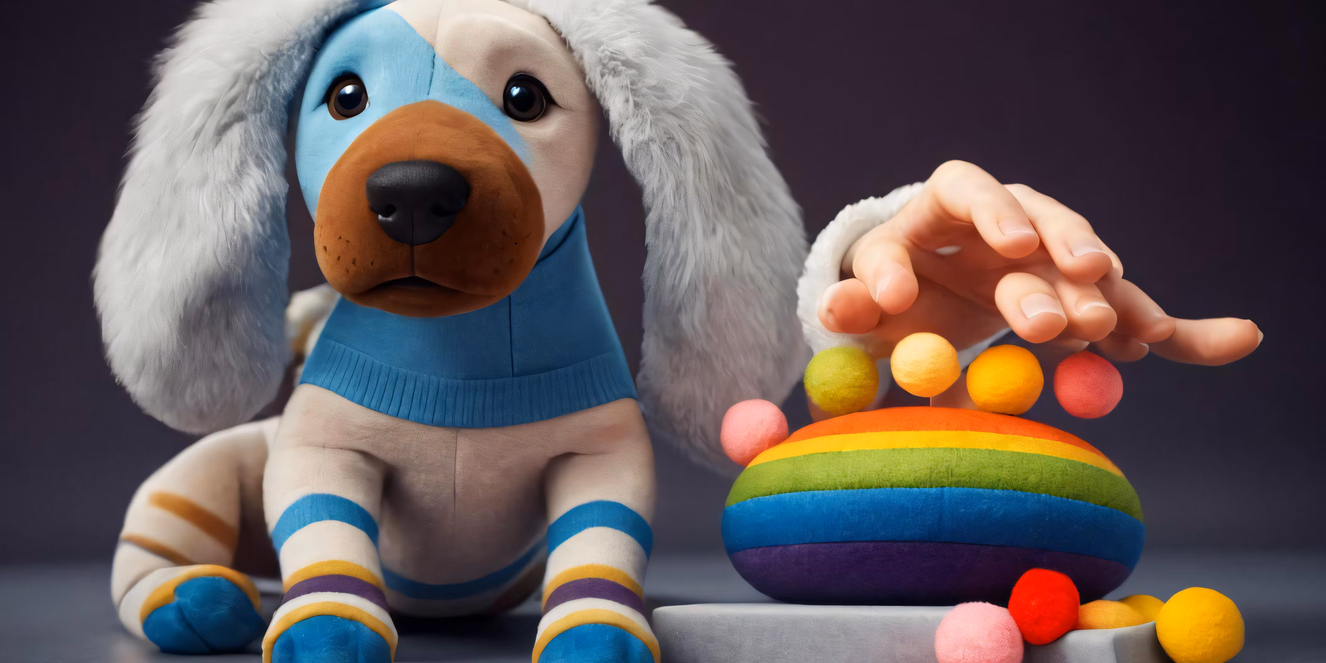 High resolution picture, free to use, a small stuffed dog is in front of a rainbow toy