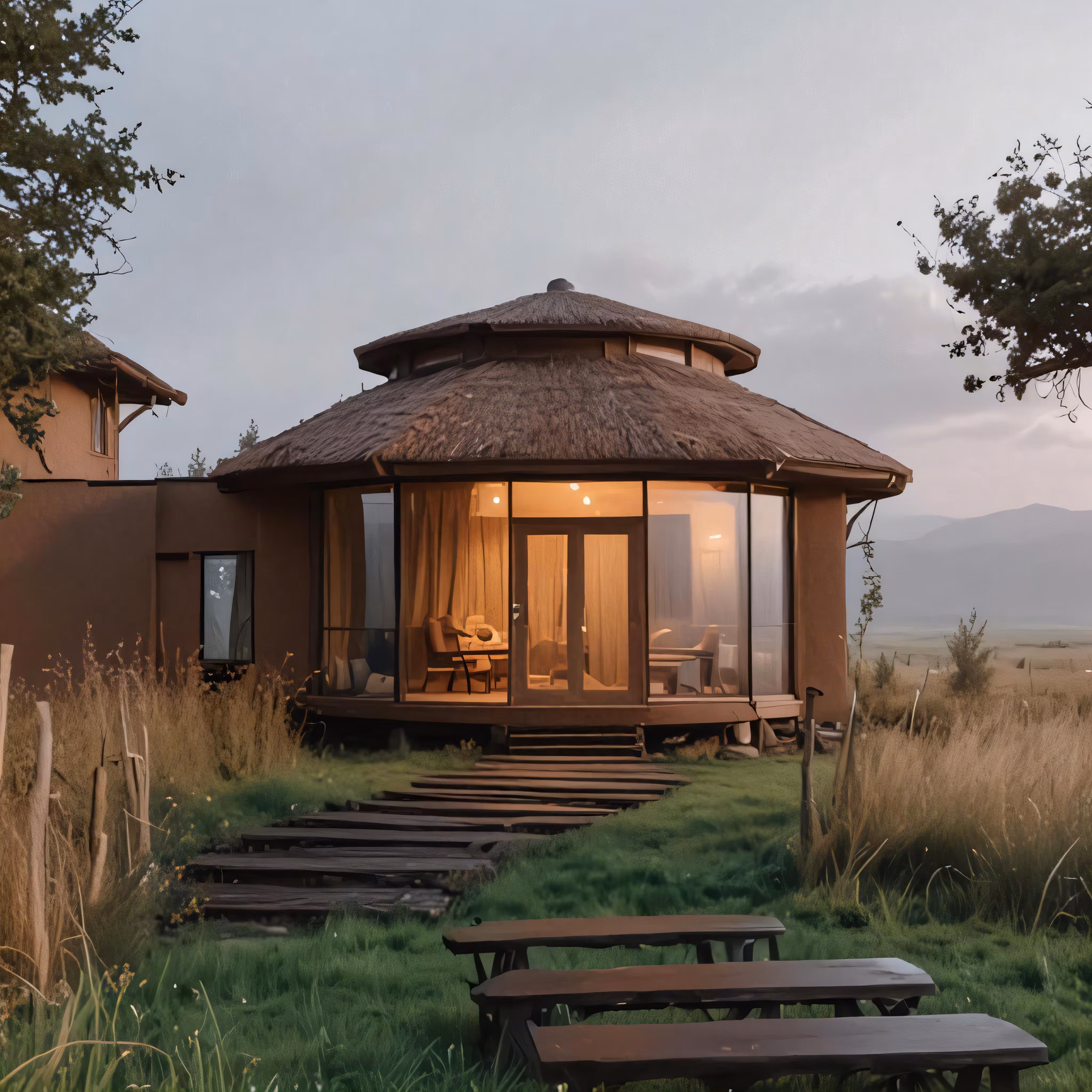 High resolution picture, free to use, a small thatched roof structure with benches in the foreground
