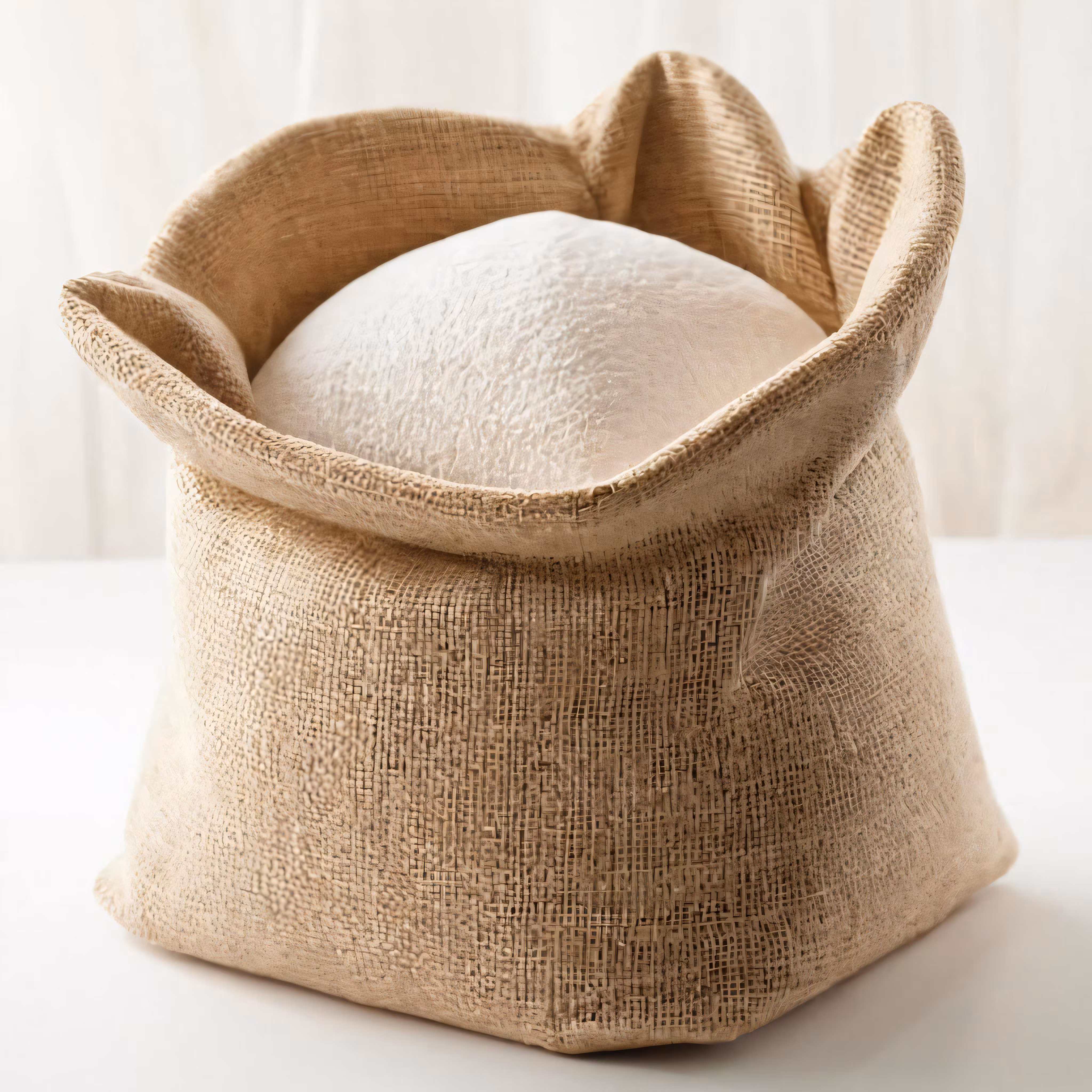 High resolution picture, free to use, a small white ball sits inside of a burlidged bag