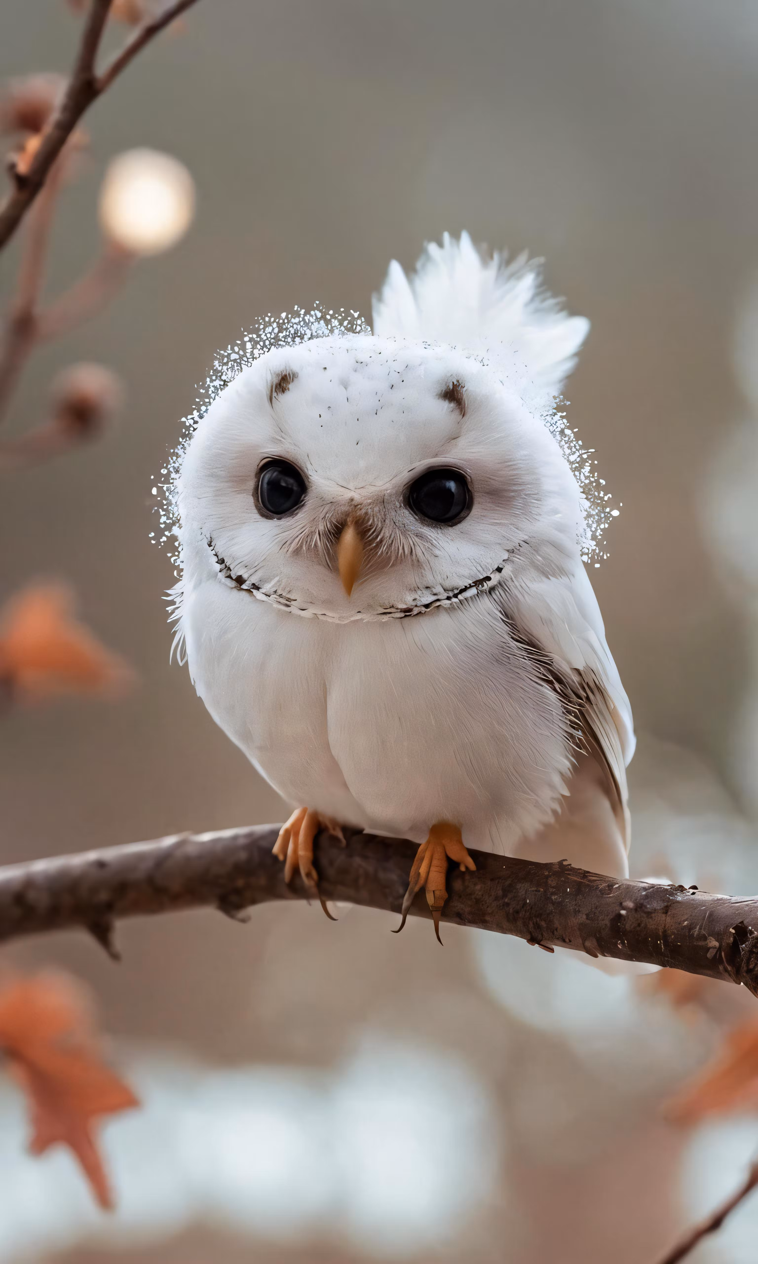 High resolution picture, free to use, a snowy owl with dark blue eyes is perched on a branch