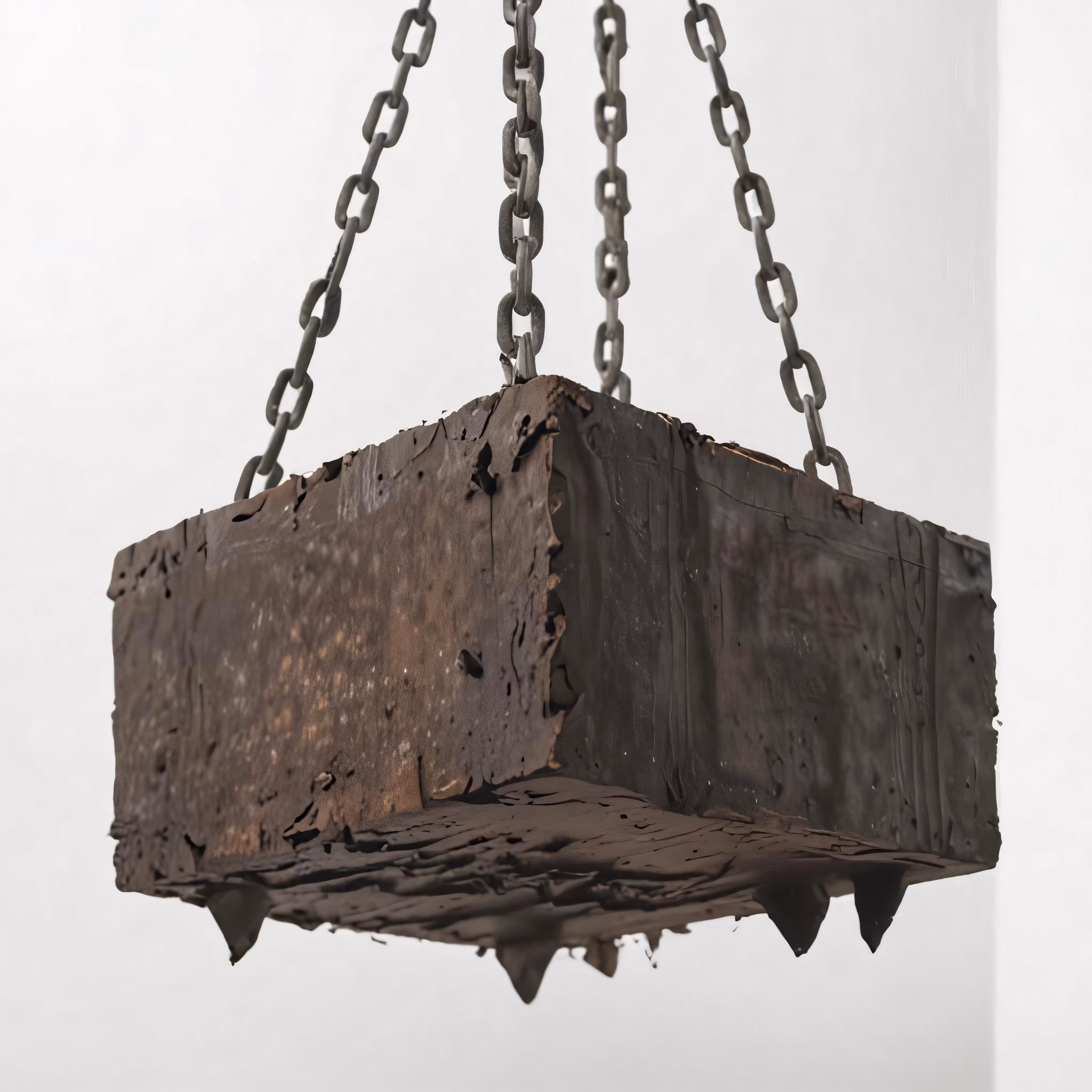 High resolution picture, free to use, a square wood box suspended from chain, with chain on the bottom