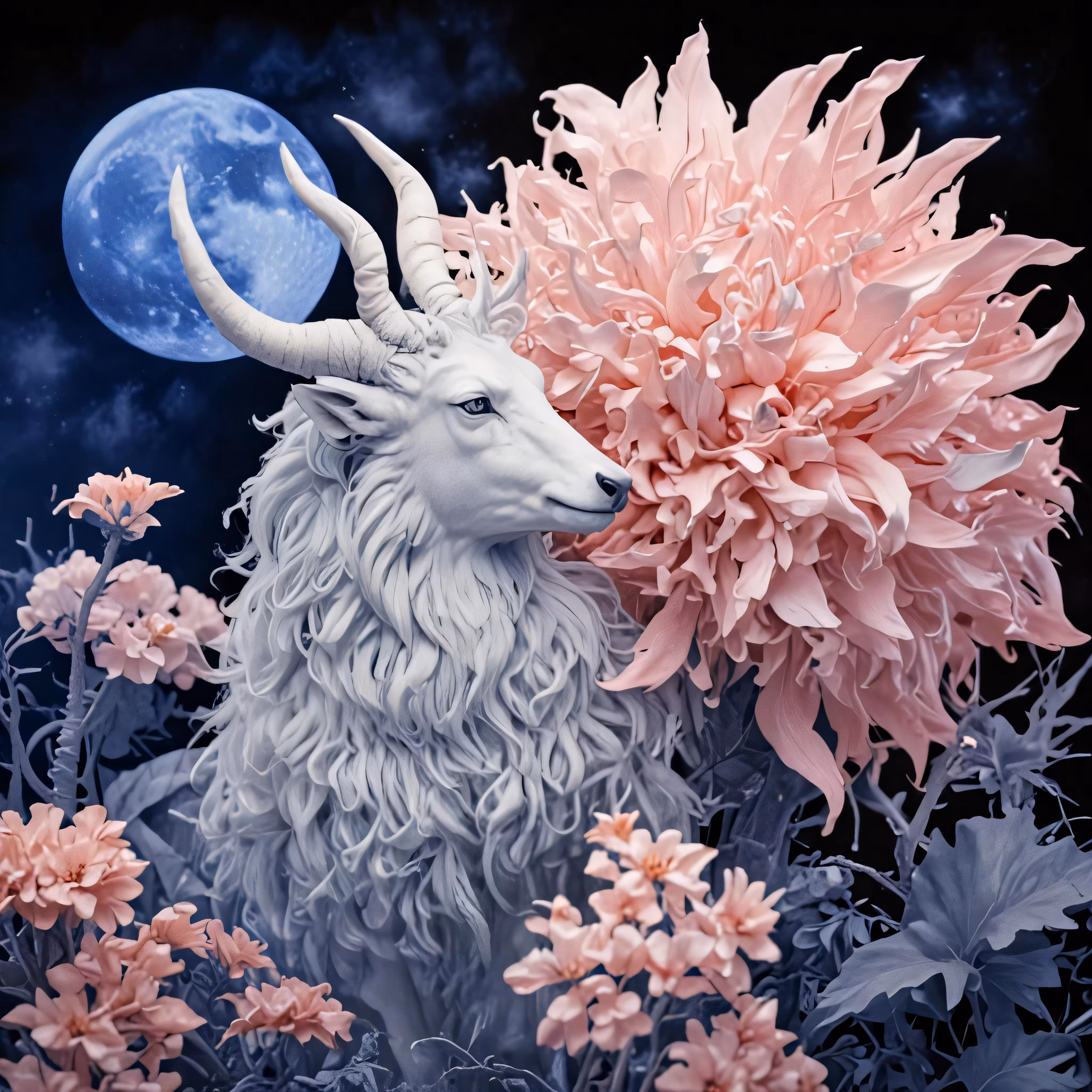 High resolution picture, free to use, a stagmoise with a large flower in its head is against the backdrop of pink and white flowers