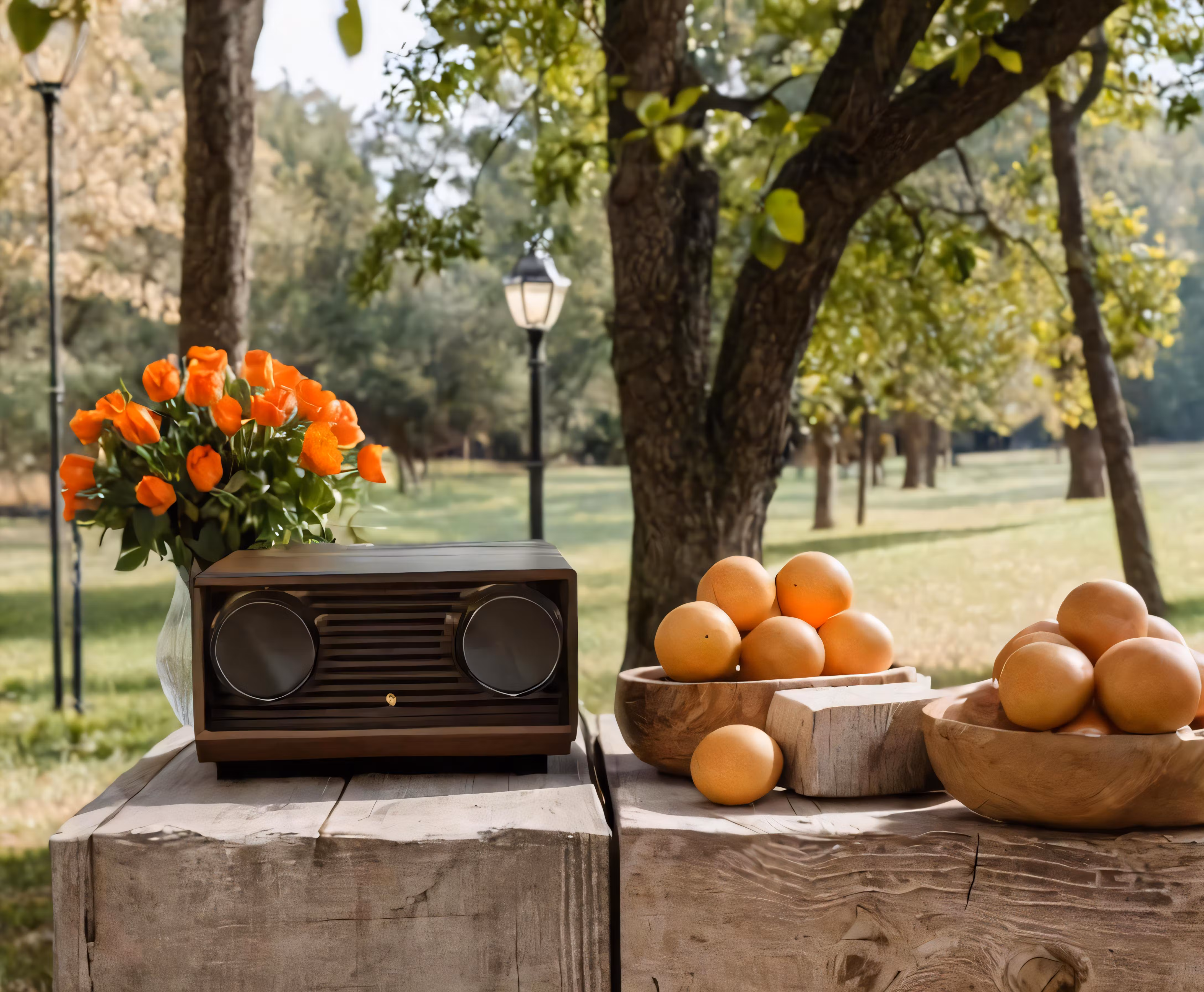High resolution picture, free to use, a stereo and bowl of oranges in the park