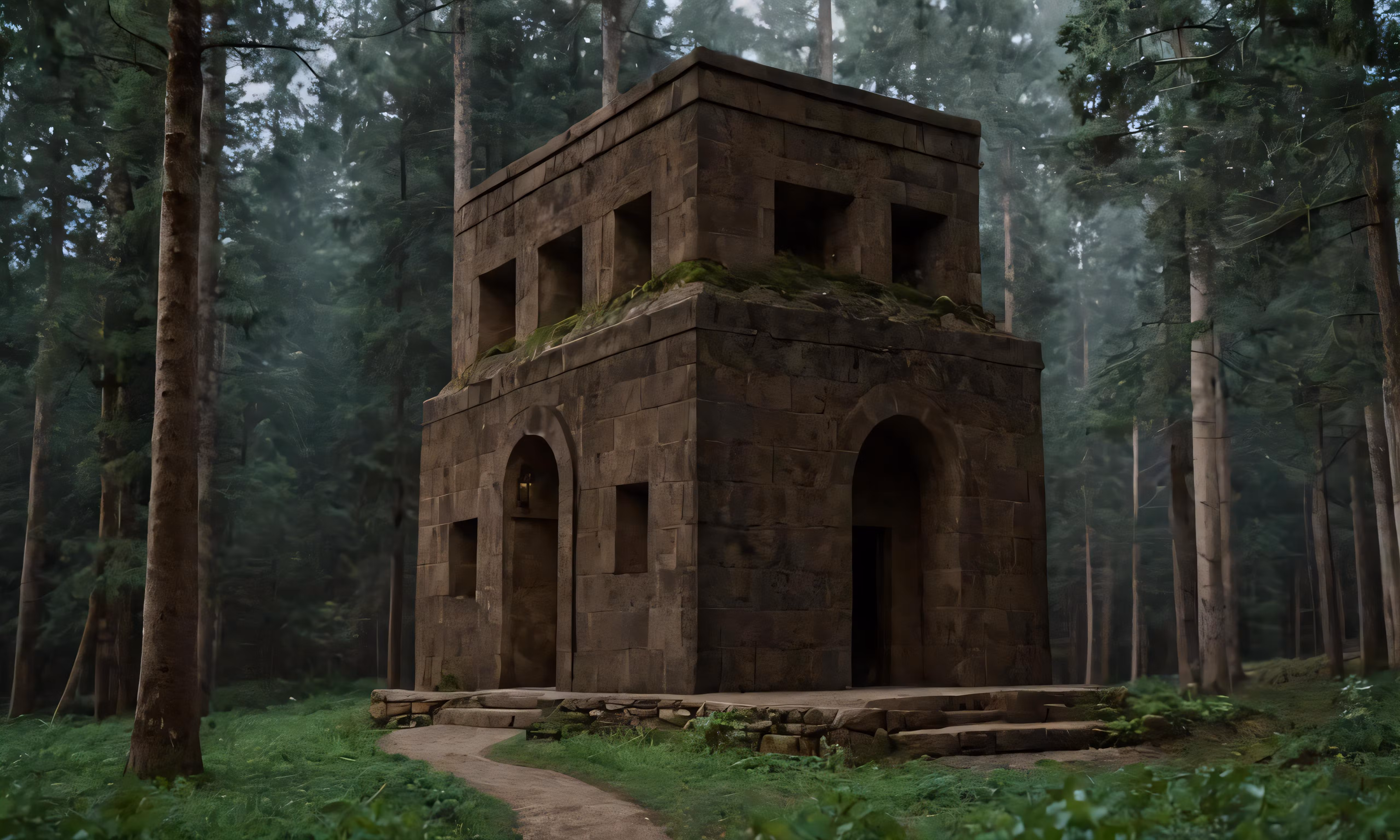 High resolution picture, free to use, a stone structure in the woods surrounded by trees