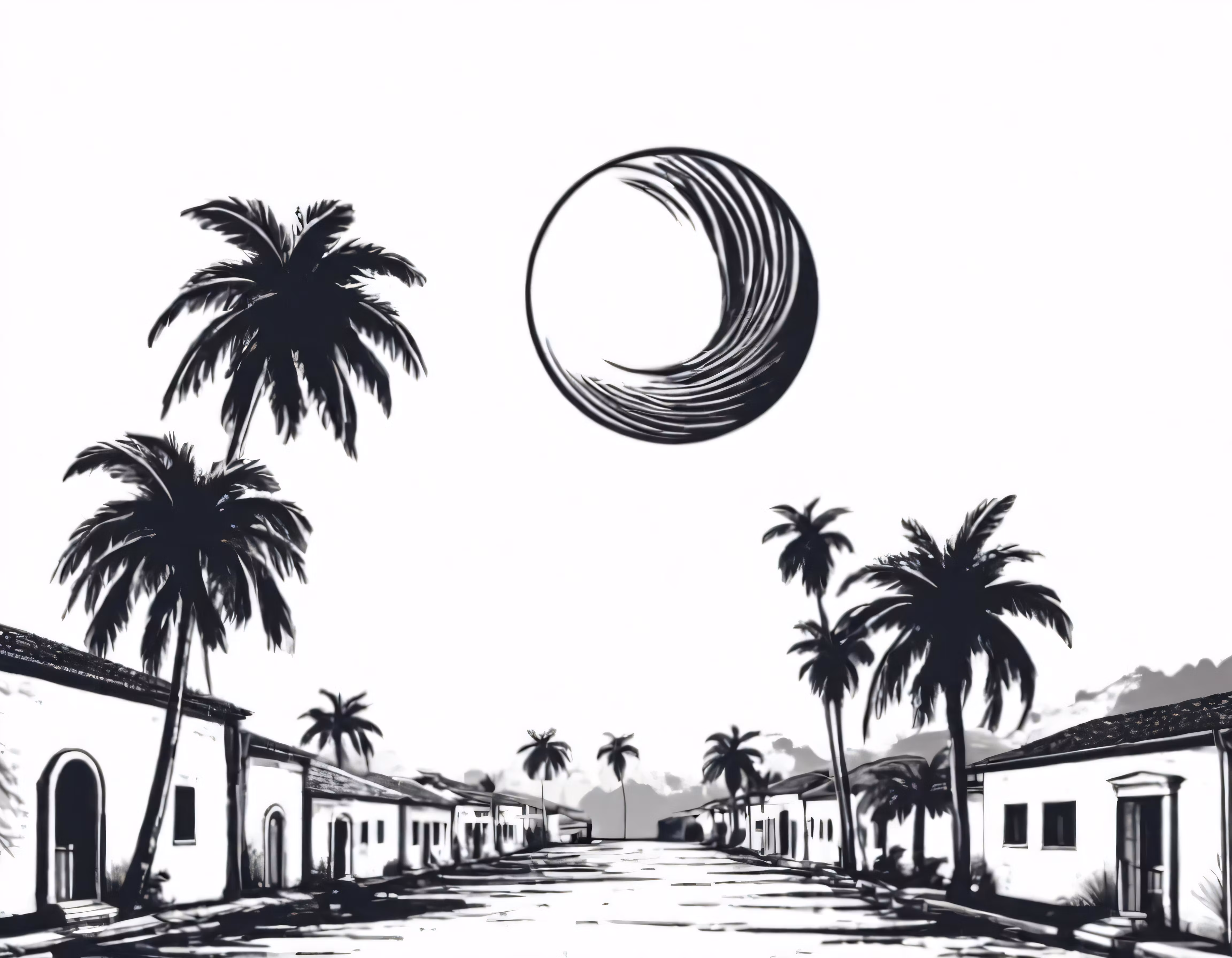 High resolution picture, free to use, a street with trees and a sun over it