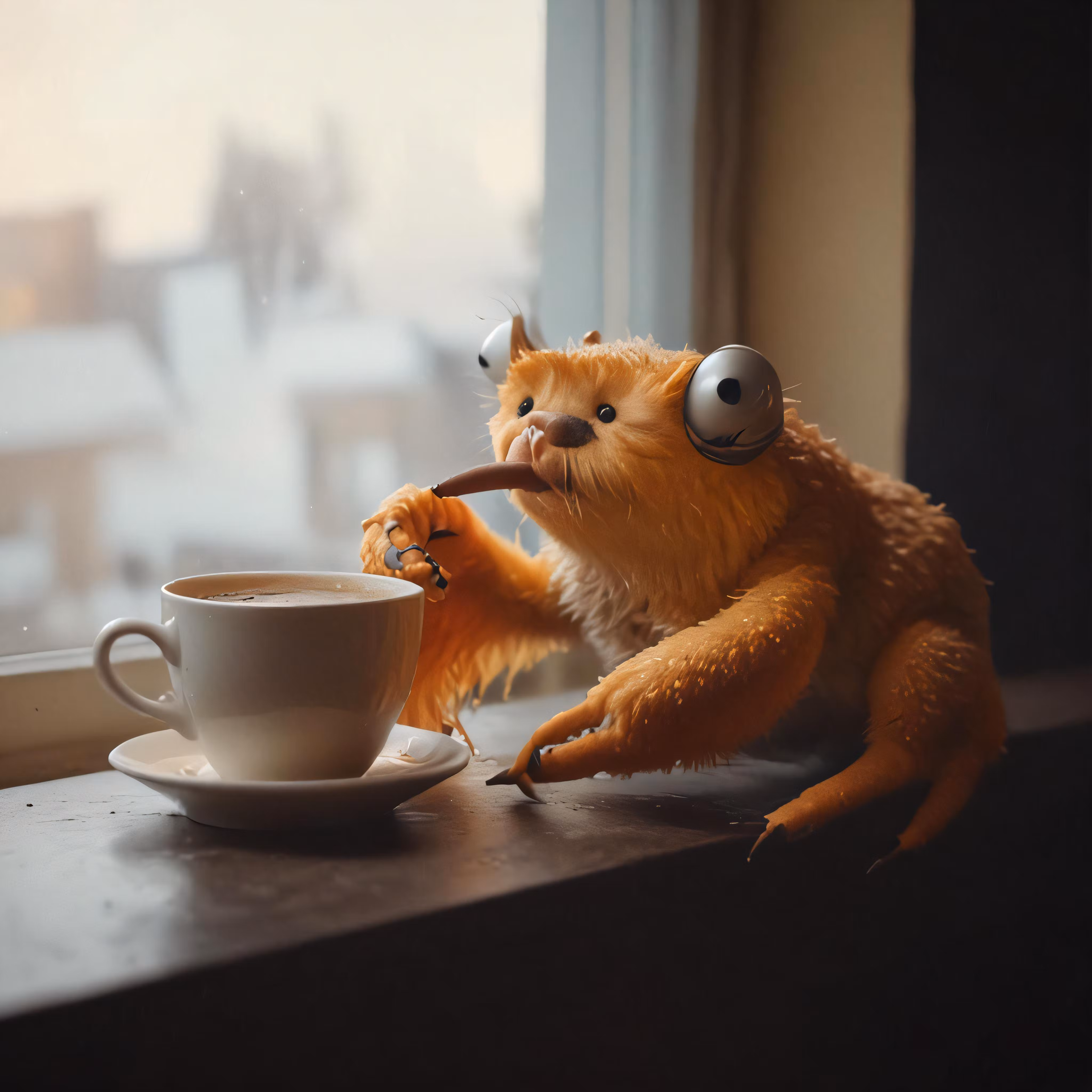 High resolution picture, free to use, a stuffed animal is drinking out of a mug
