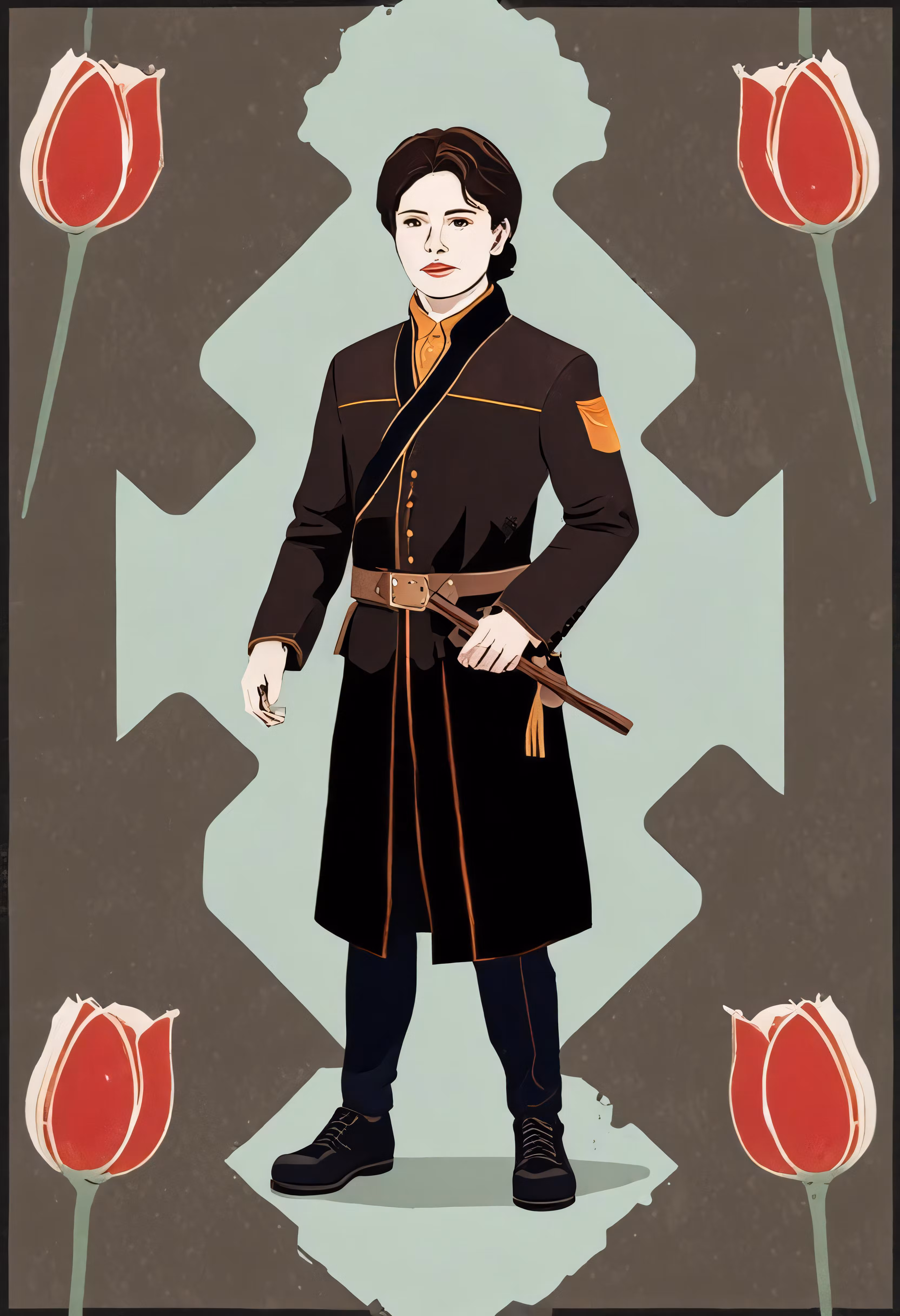 High resolution picture, free to use, a stylized painting of a man standing in front of flowers