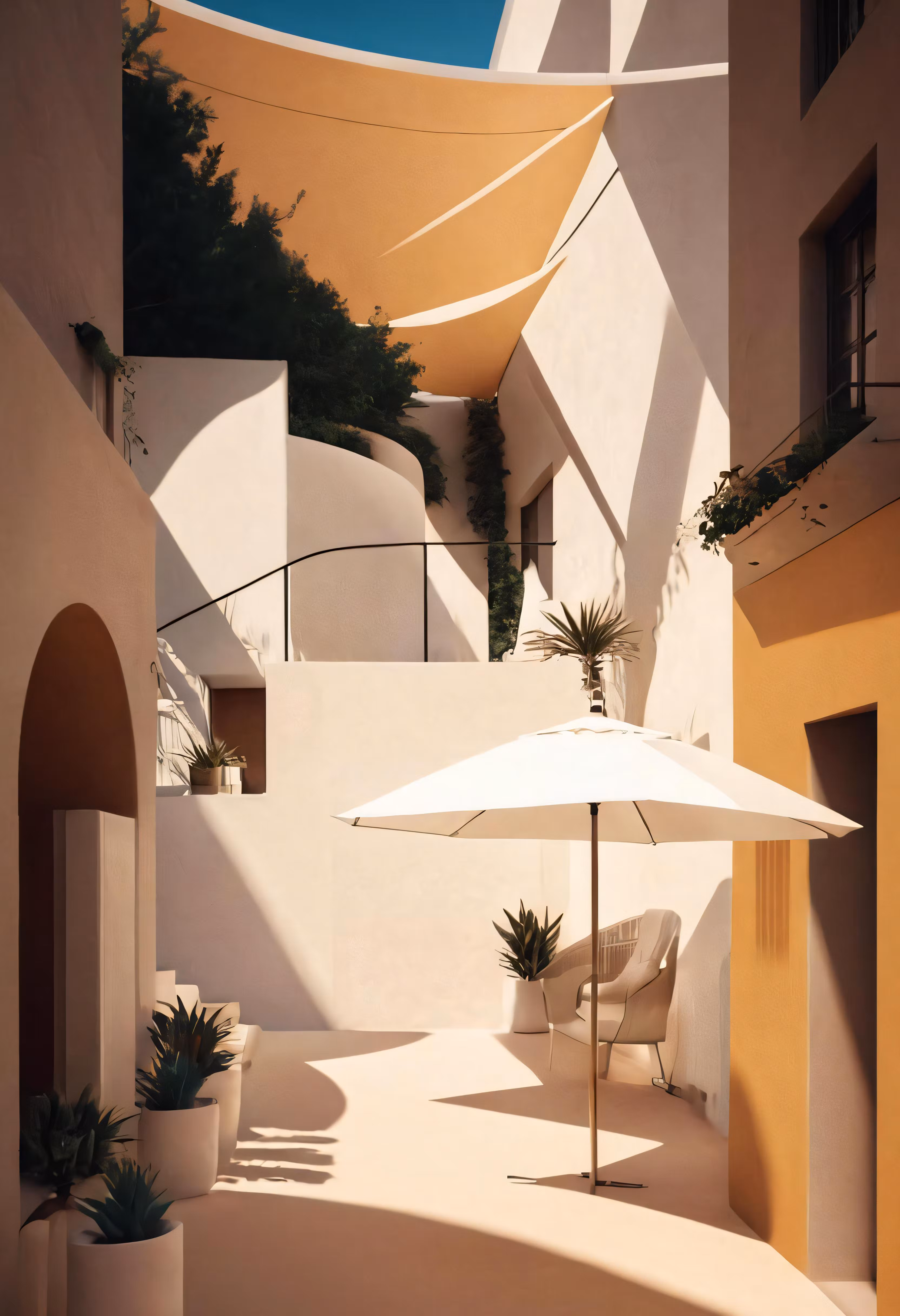 High resolution picture, free to use, a sun drenched patio area with an umbrella