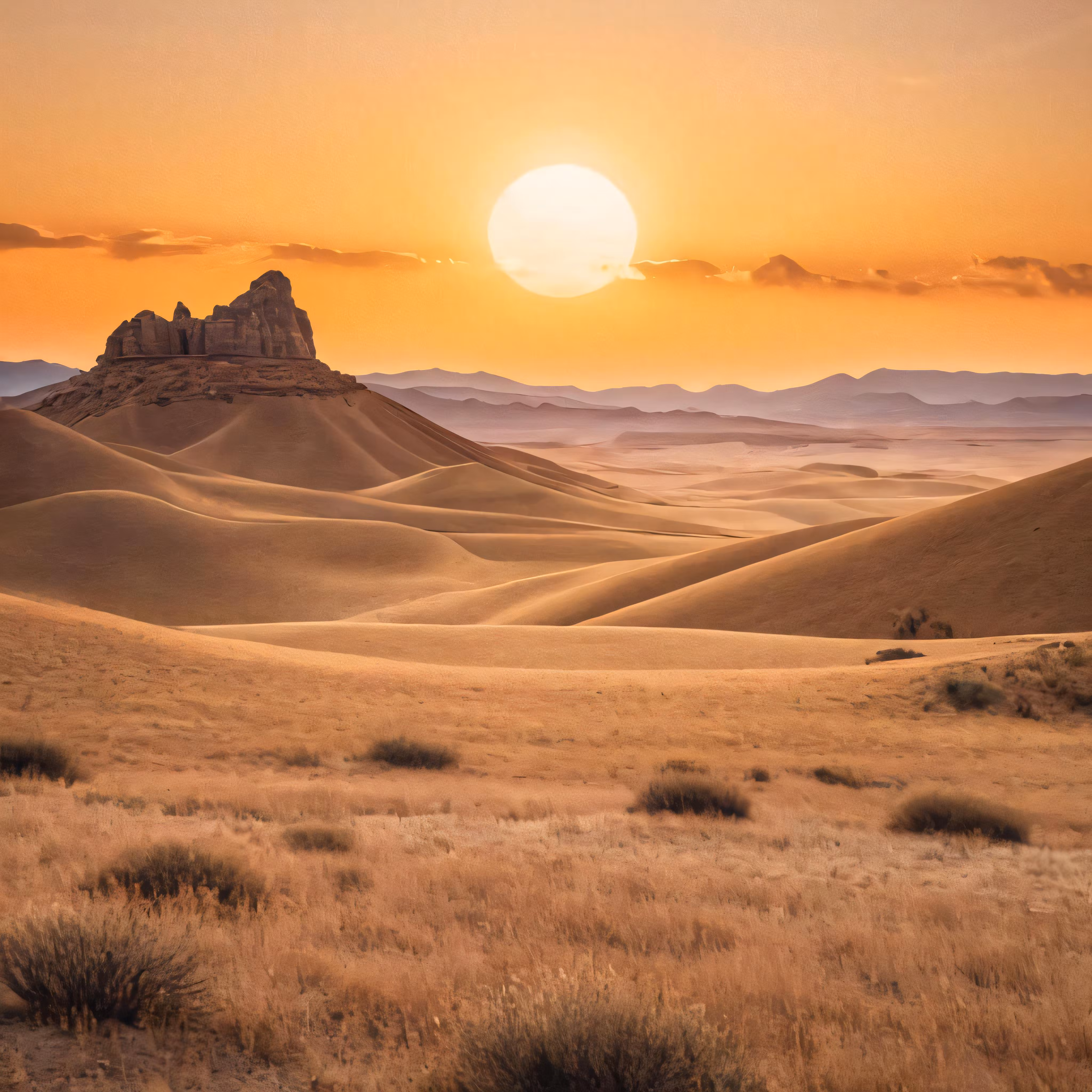 High resolution picture, free to use, a sun set behind a desert landscape with sparse grass