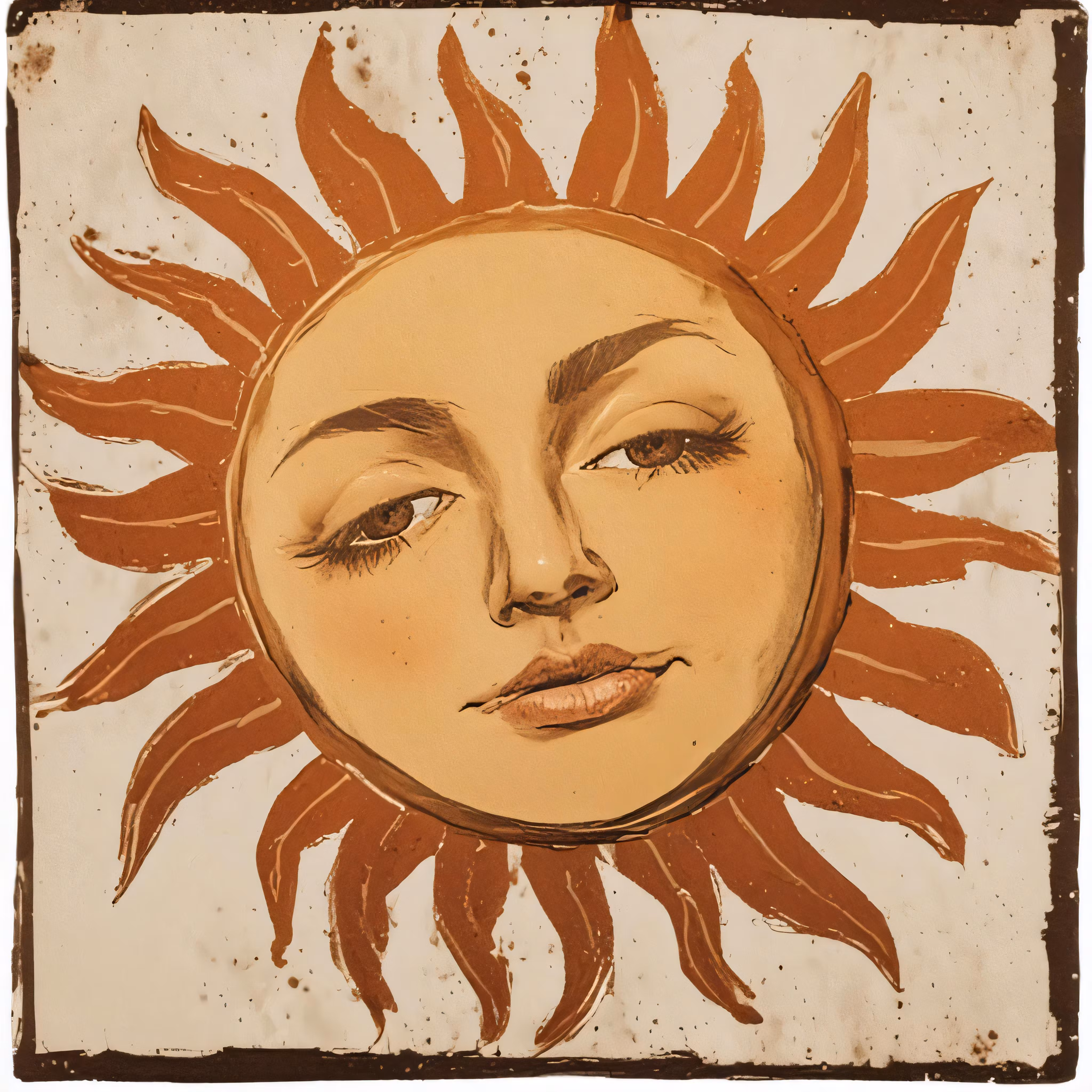 High resolution picture, free to use, a sun with a face is painted on ceramic