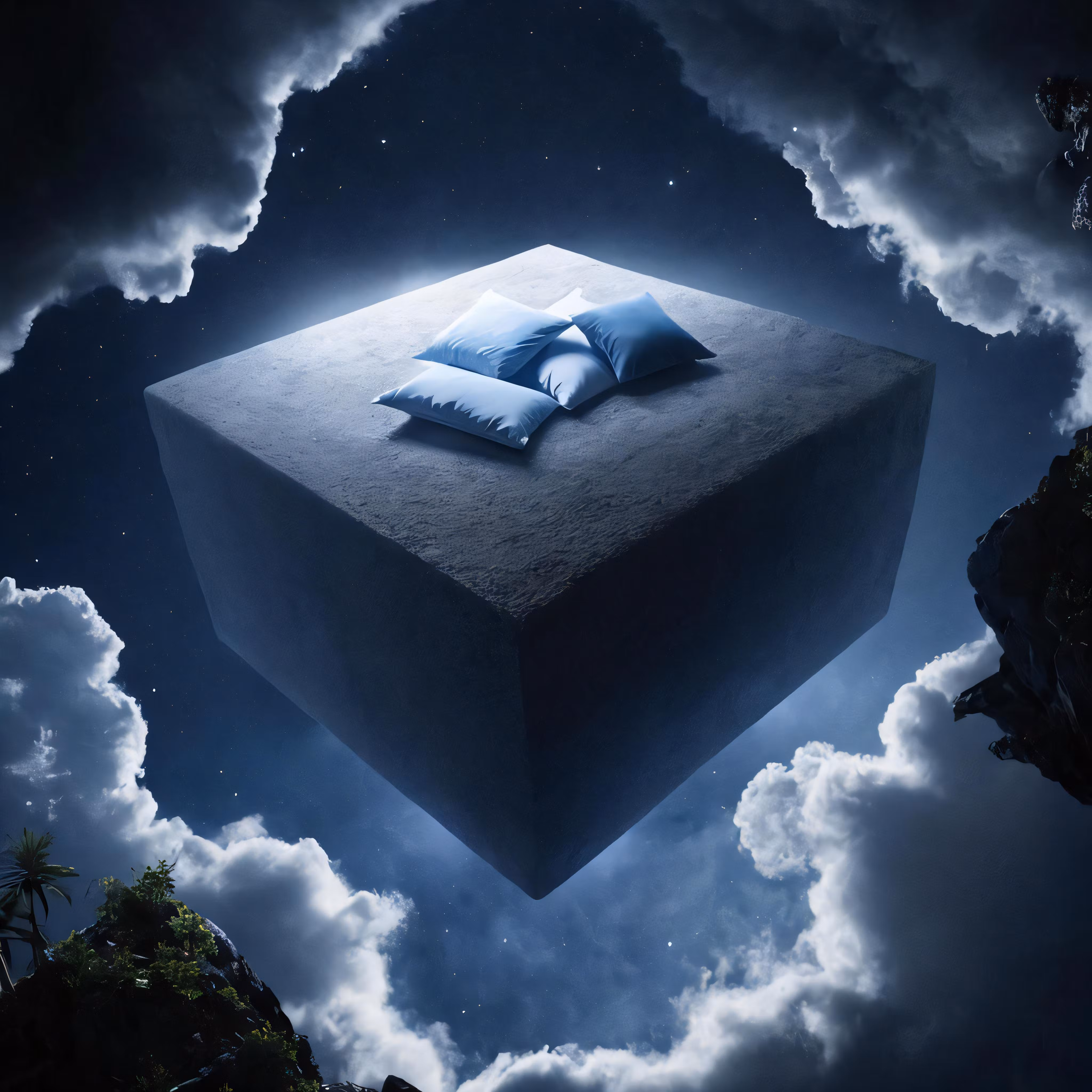 High resolution picture, free to use, a surreal image of a bed in the clouds with blue pillows