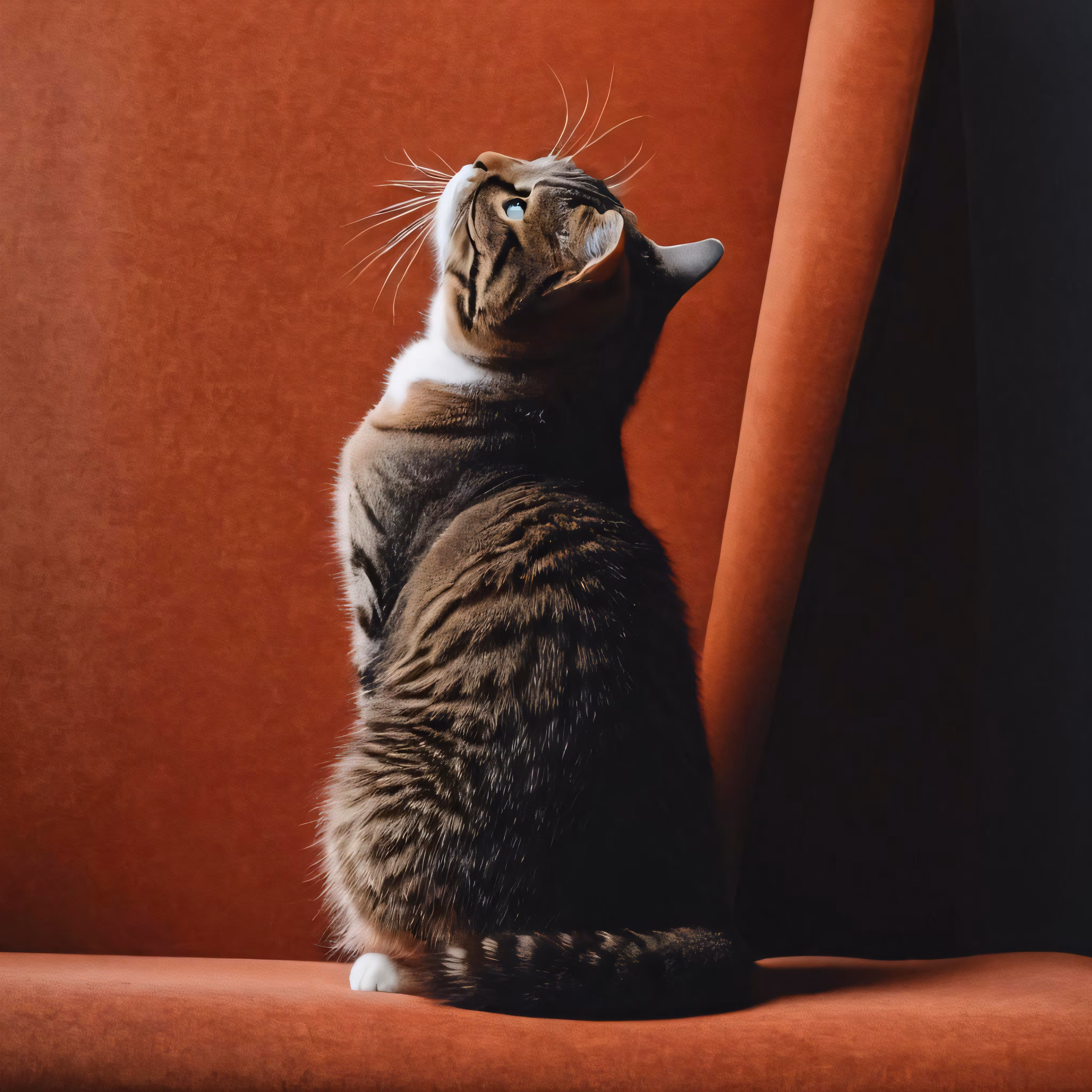 High resolution picture, free to use, a tabby cat is sitting on a red chair
