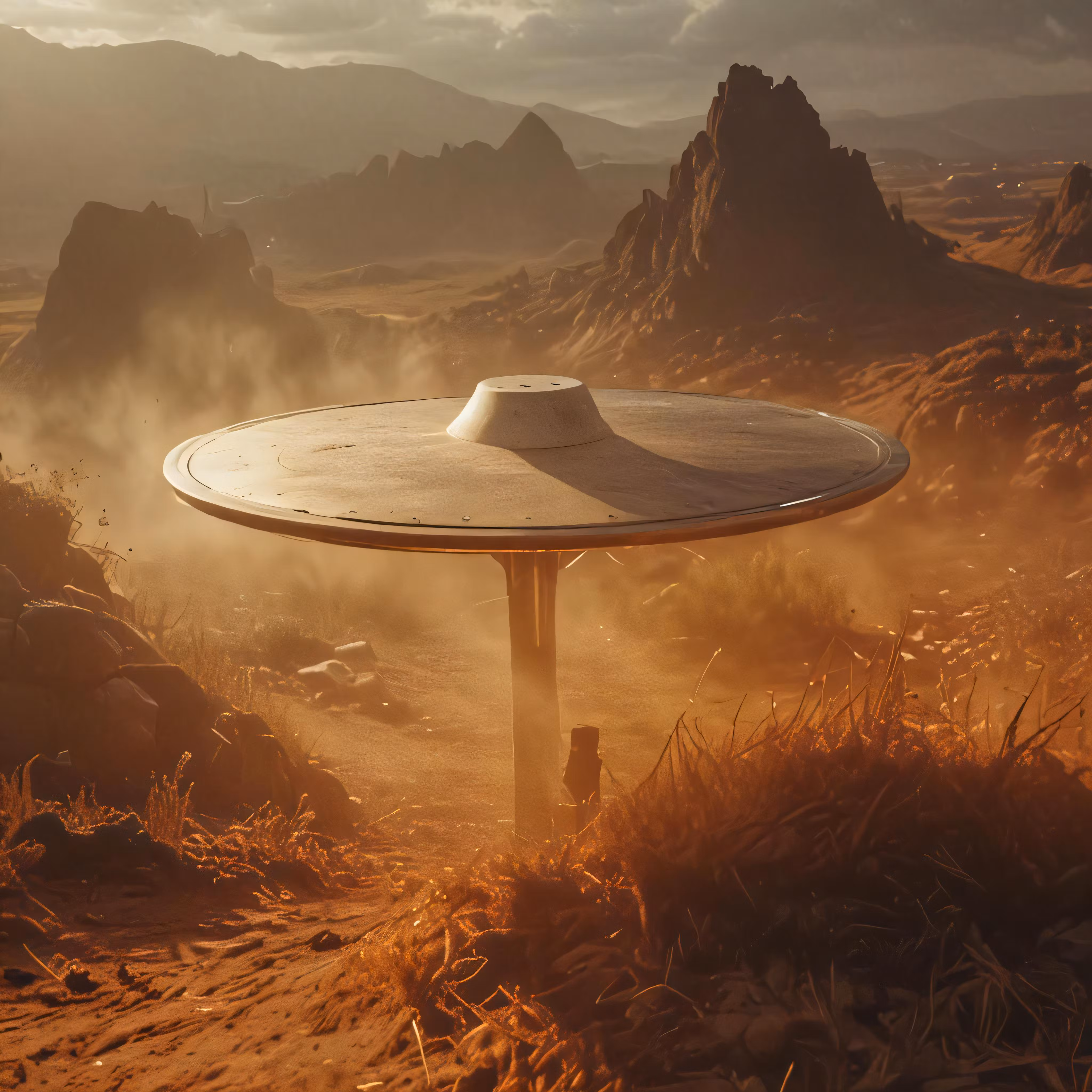 High resolution picture, free to use, a table on a dry, rocky ground surrounded by dust