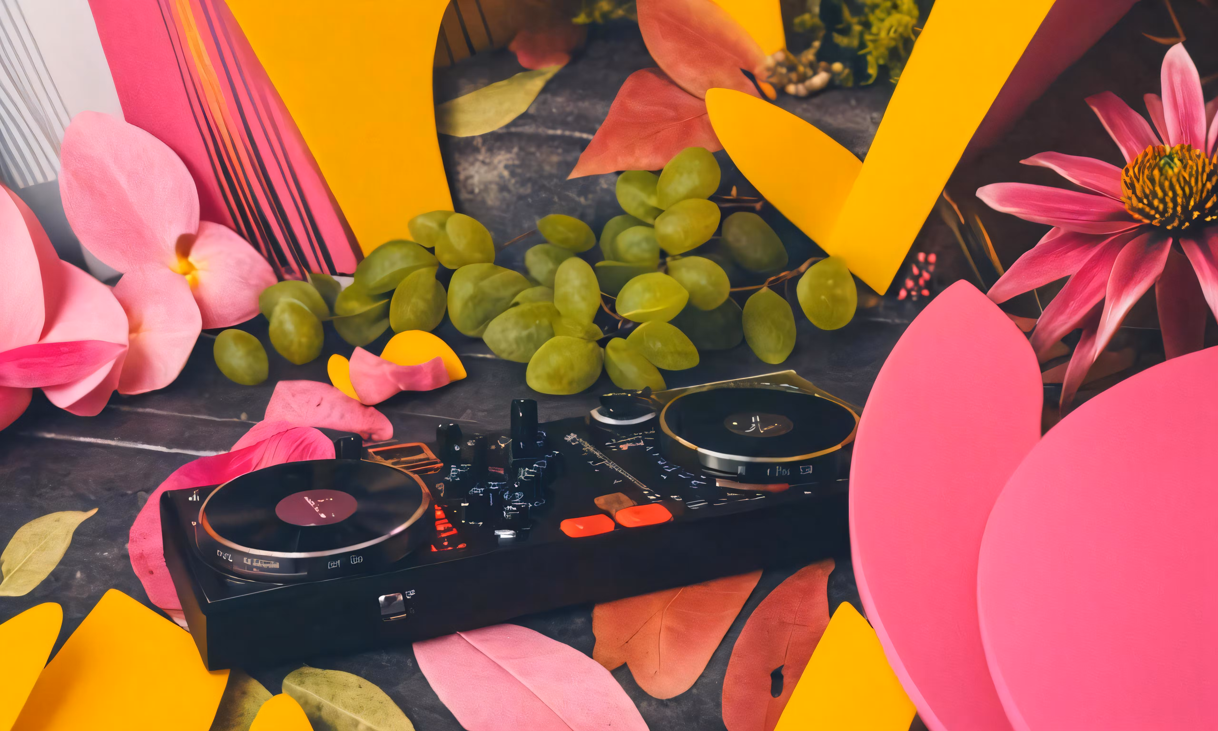 High resolution picture, free to use, a table topped with pink and yellow table cloth