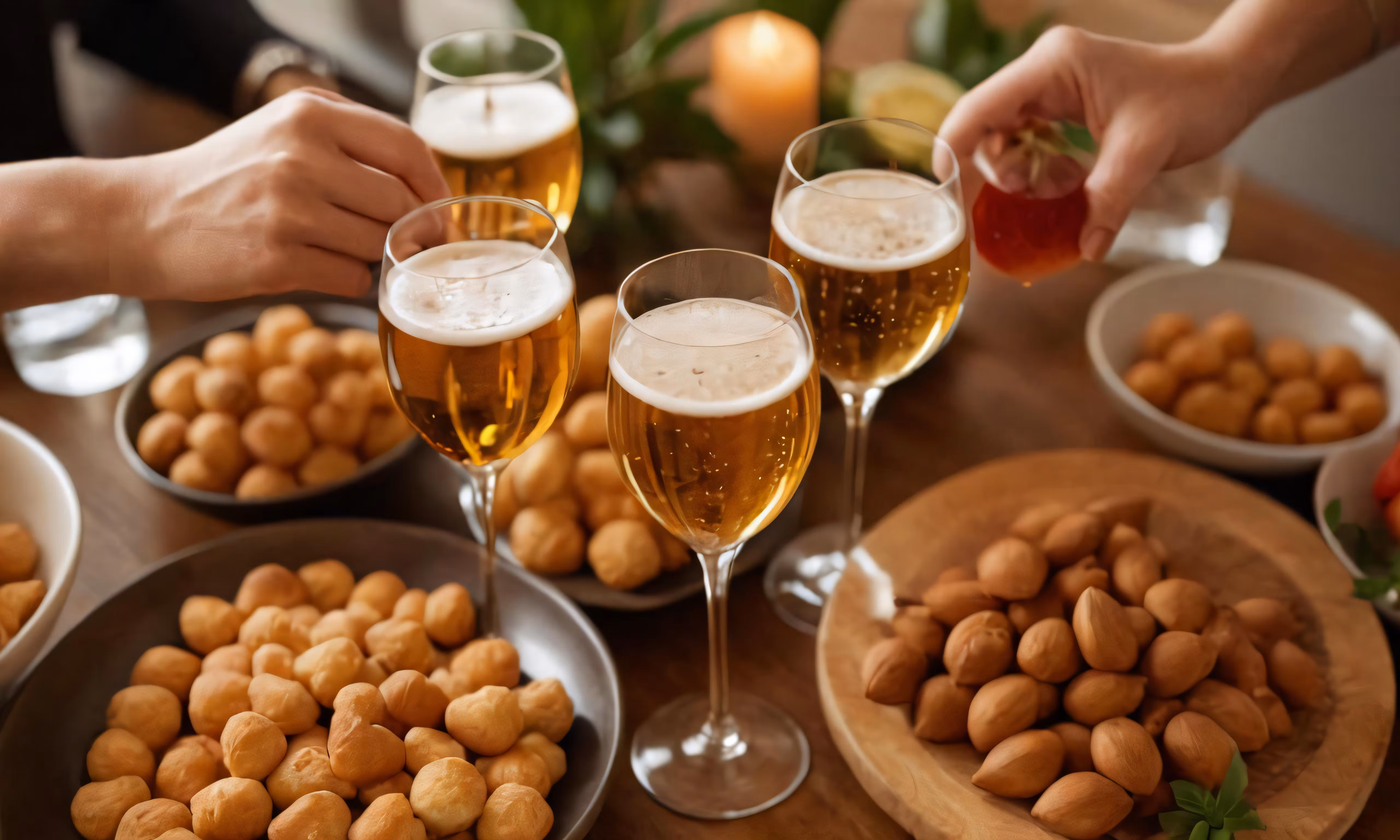 High resolution picture, free to use, a table with different types of food and glasses of beer