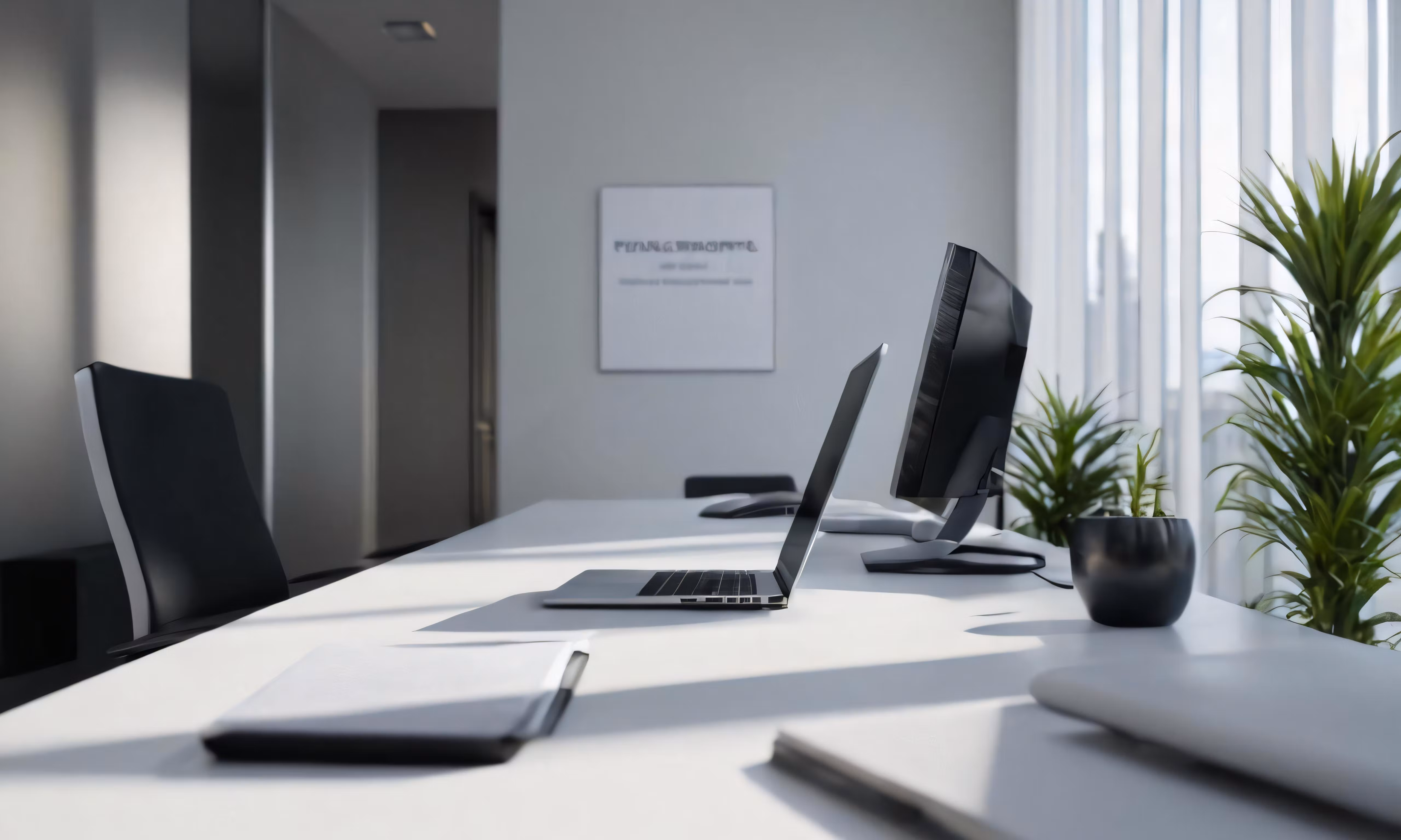 High resolution picture, free to use, a table with two computer screens sitting next to a potted plant