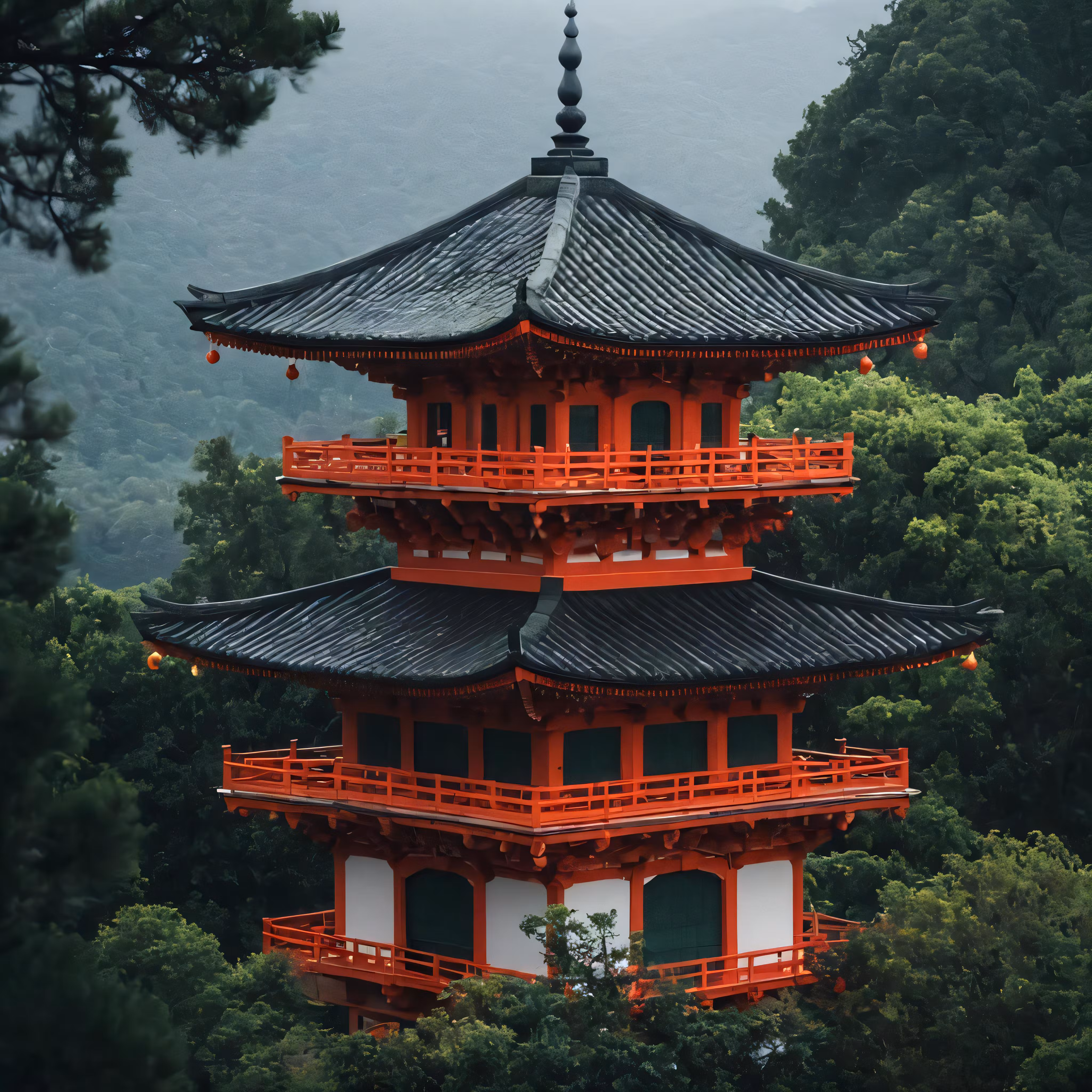 High resolution picture, free to use, a tall building surrounded by trees in front of some mountains