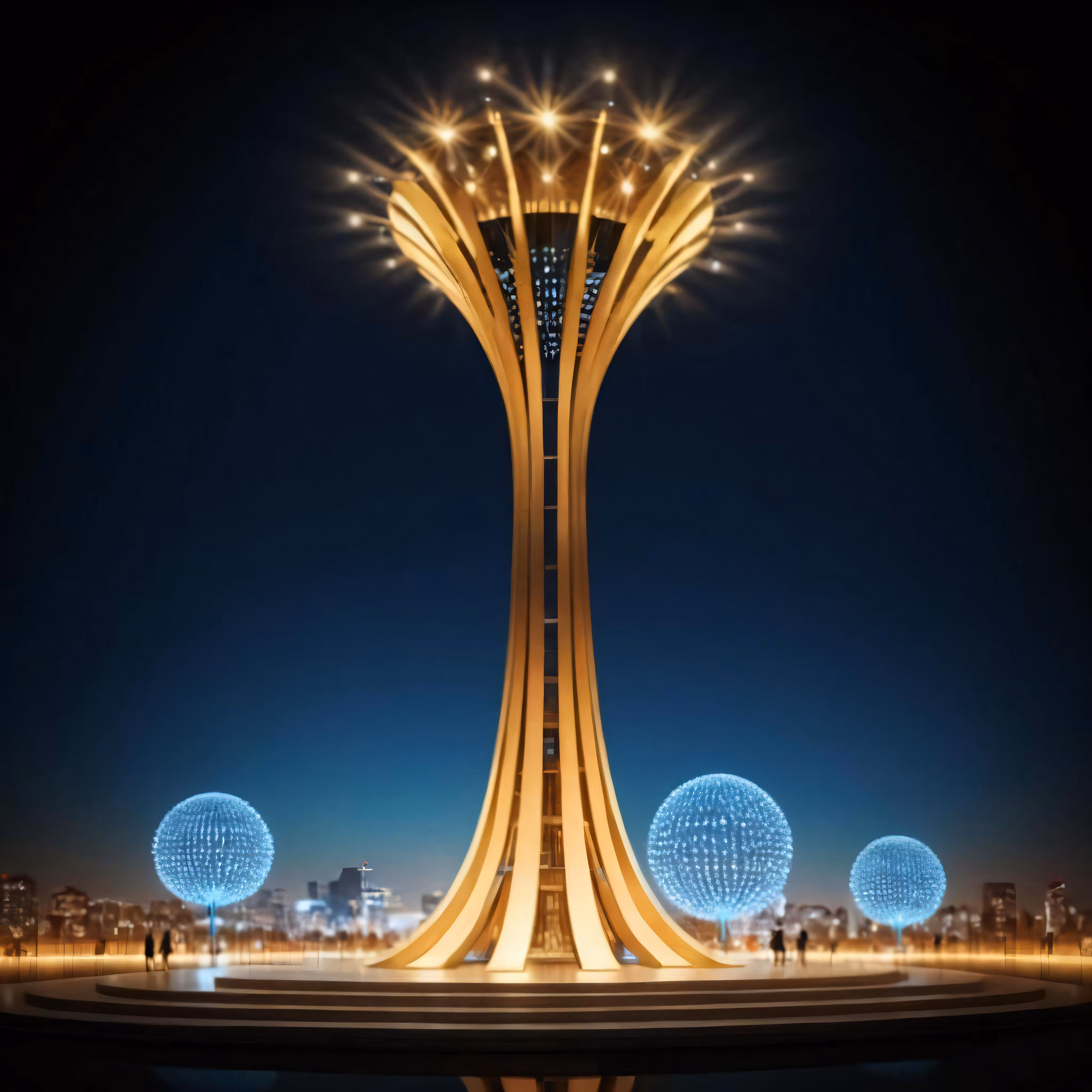 High resolution picture, free to use, a tall tower with illuminated decorations sits in the middle of a town
