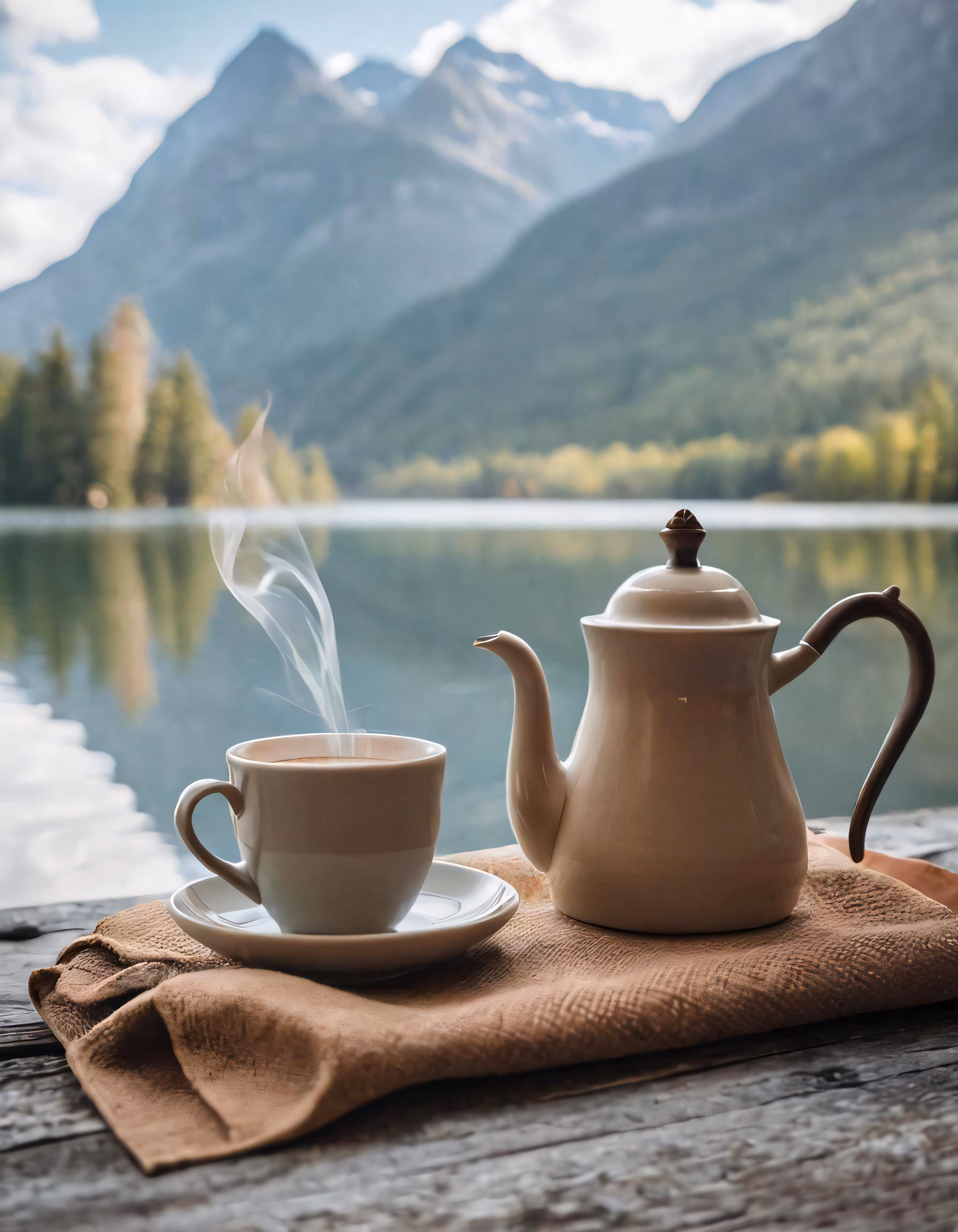 High resolution picture, free to use, a tea pot, cup and saucer sitting on a towel on a wooden dock