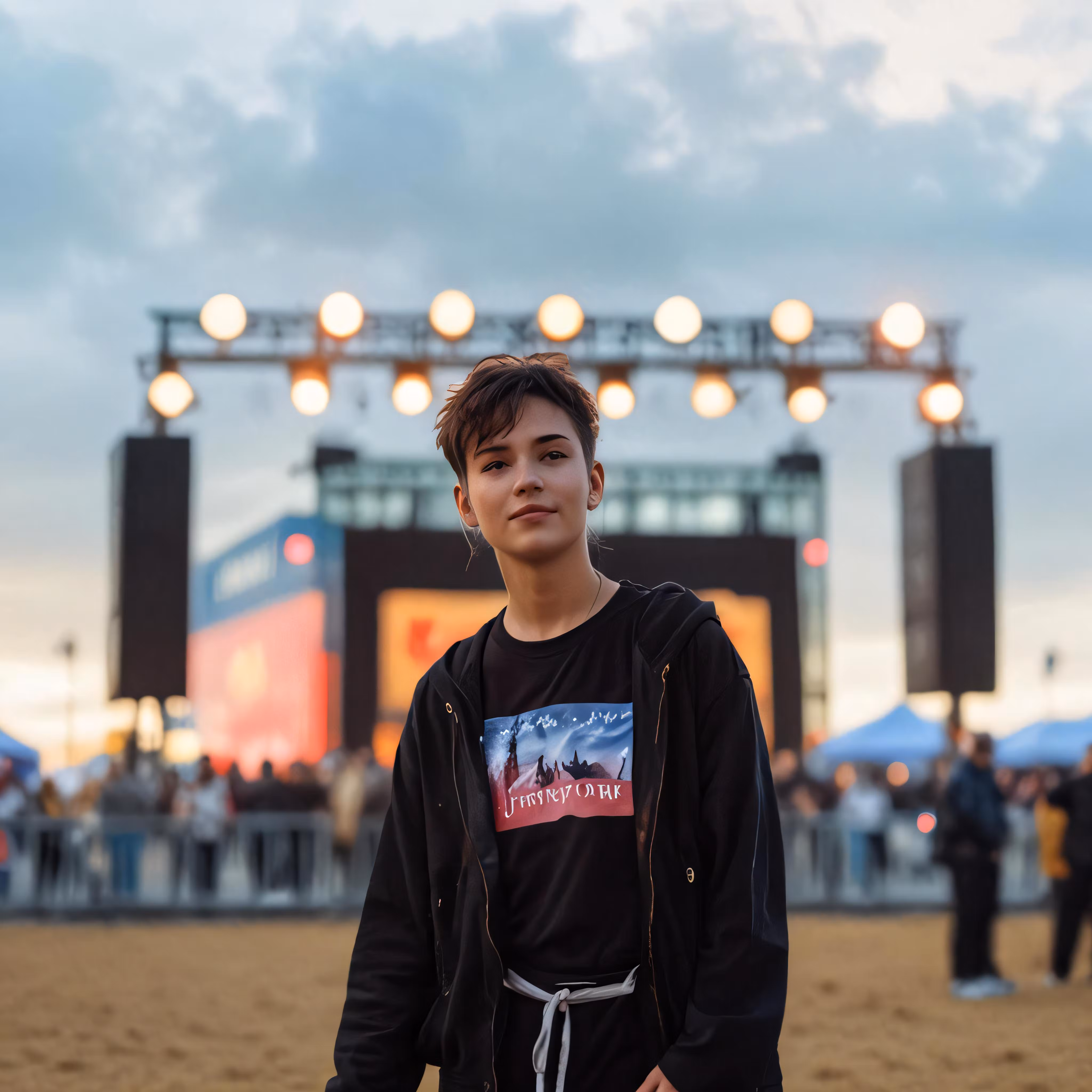 High resolution picture, free to use, a teenage boy standing in front of an arena at a concert
