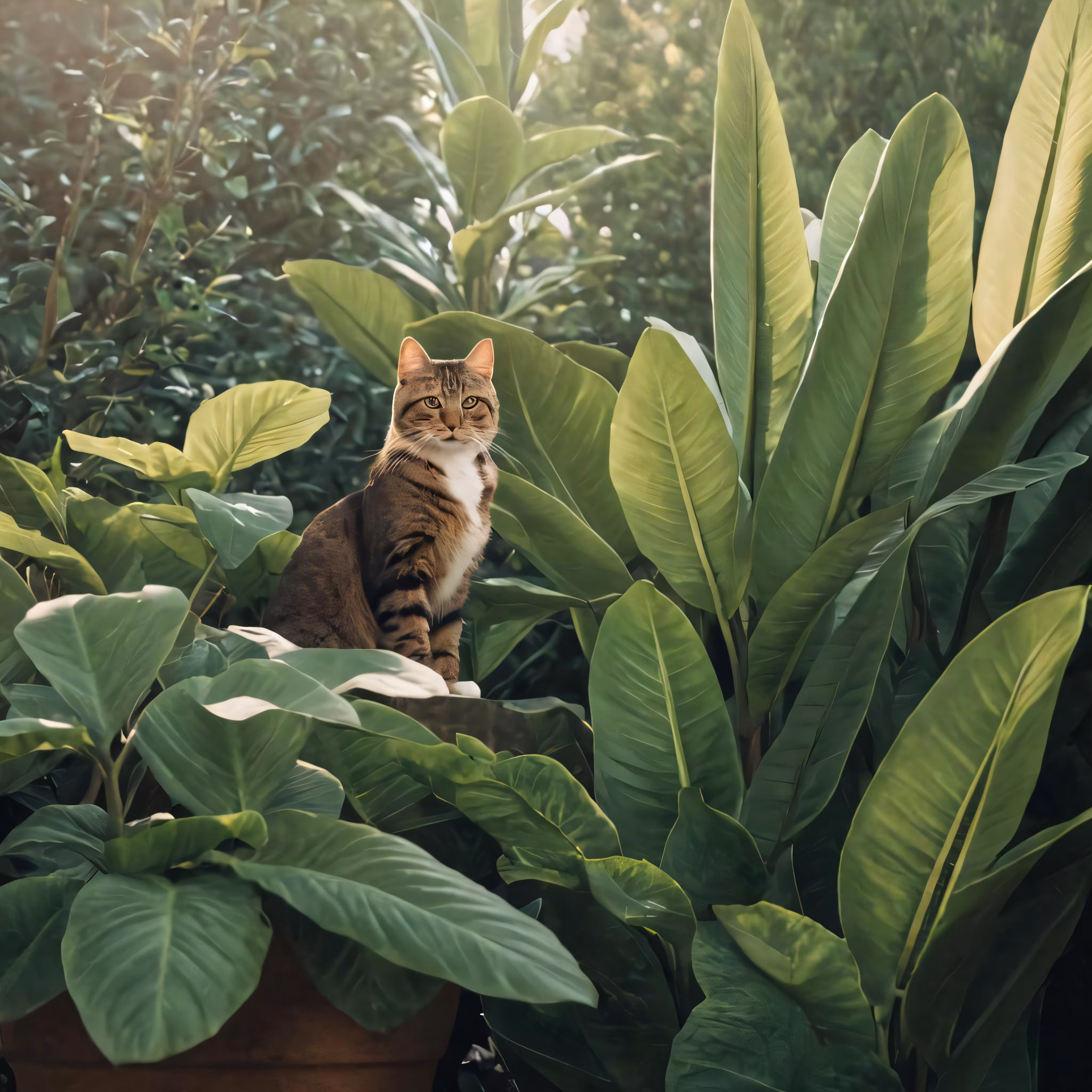 High resolution picture, free to use, a tiger cat sitting in the middle of a pot full of green plants