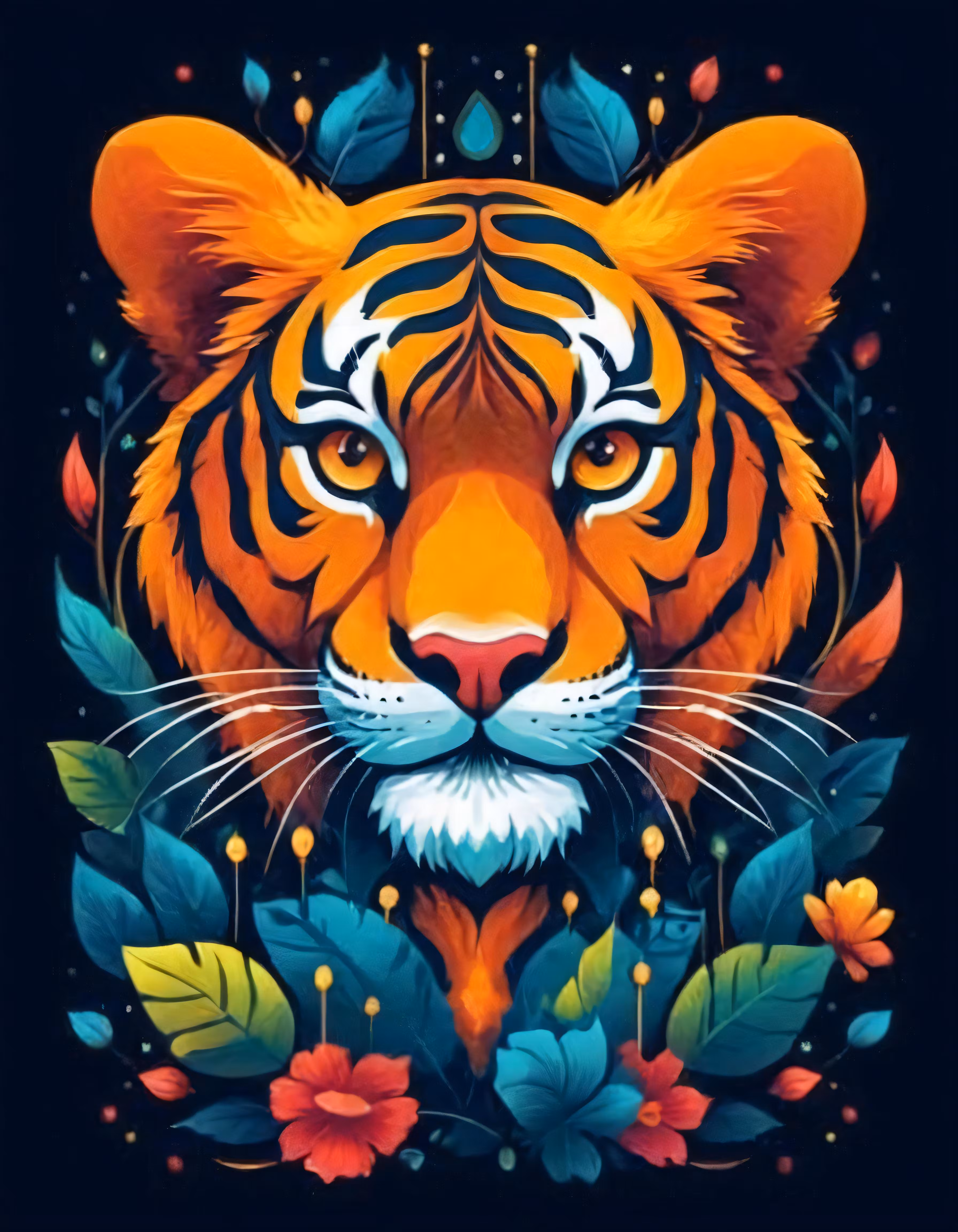 High resolution picture, free to use, a tiger with flowers in the corner of the image