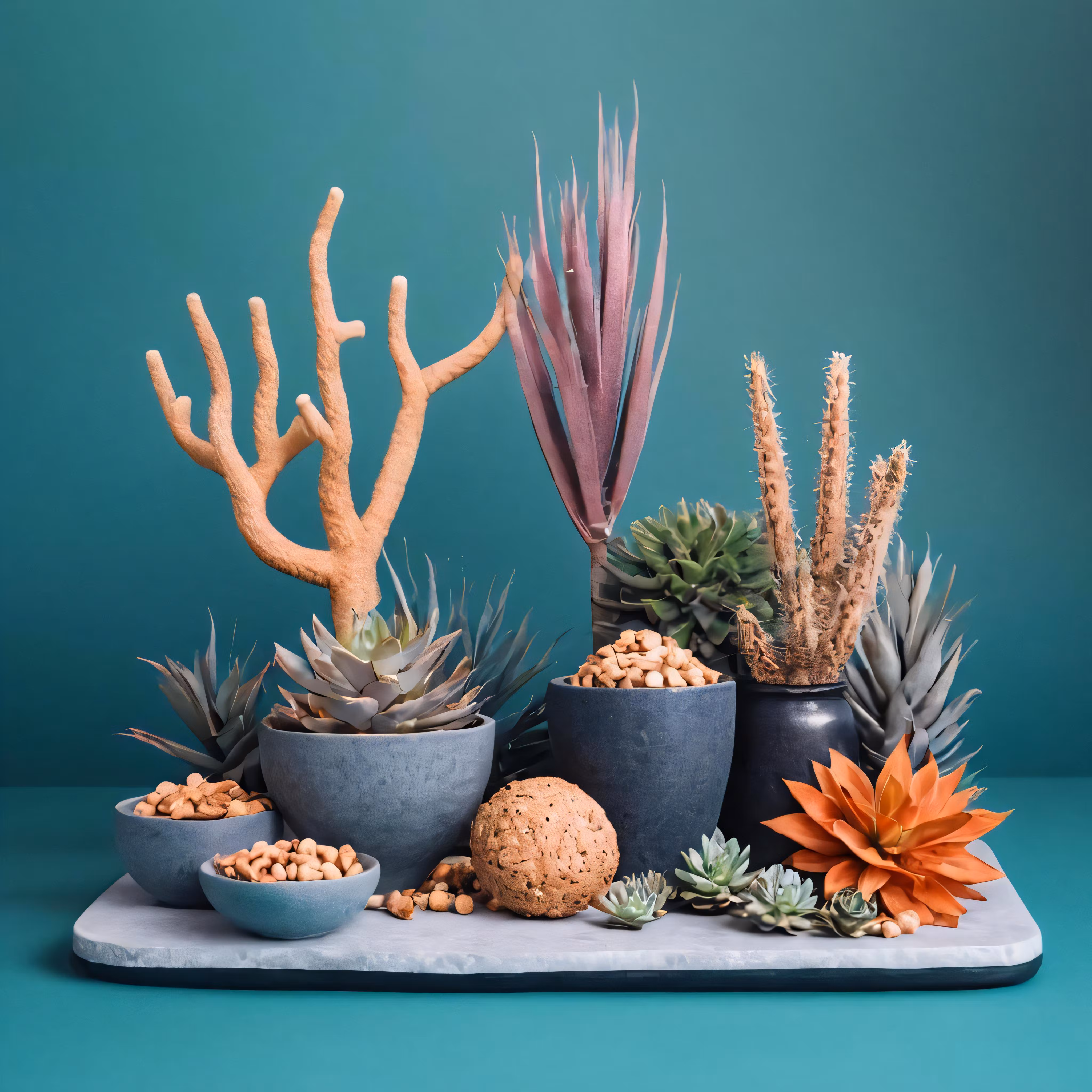 High resolution picture, free to use, a variety of cacti in different pots sit atop a slate tray