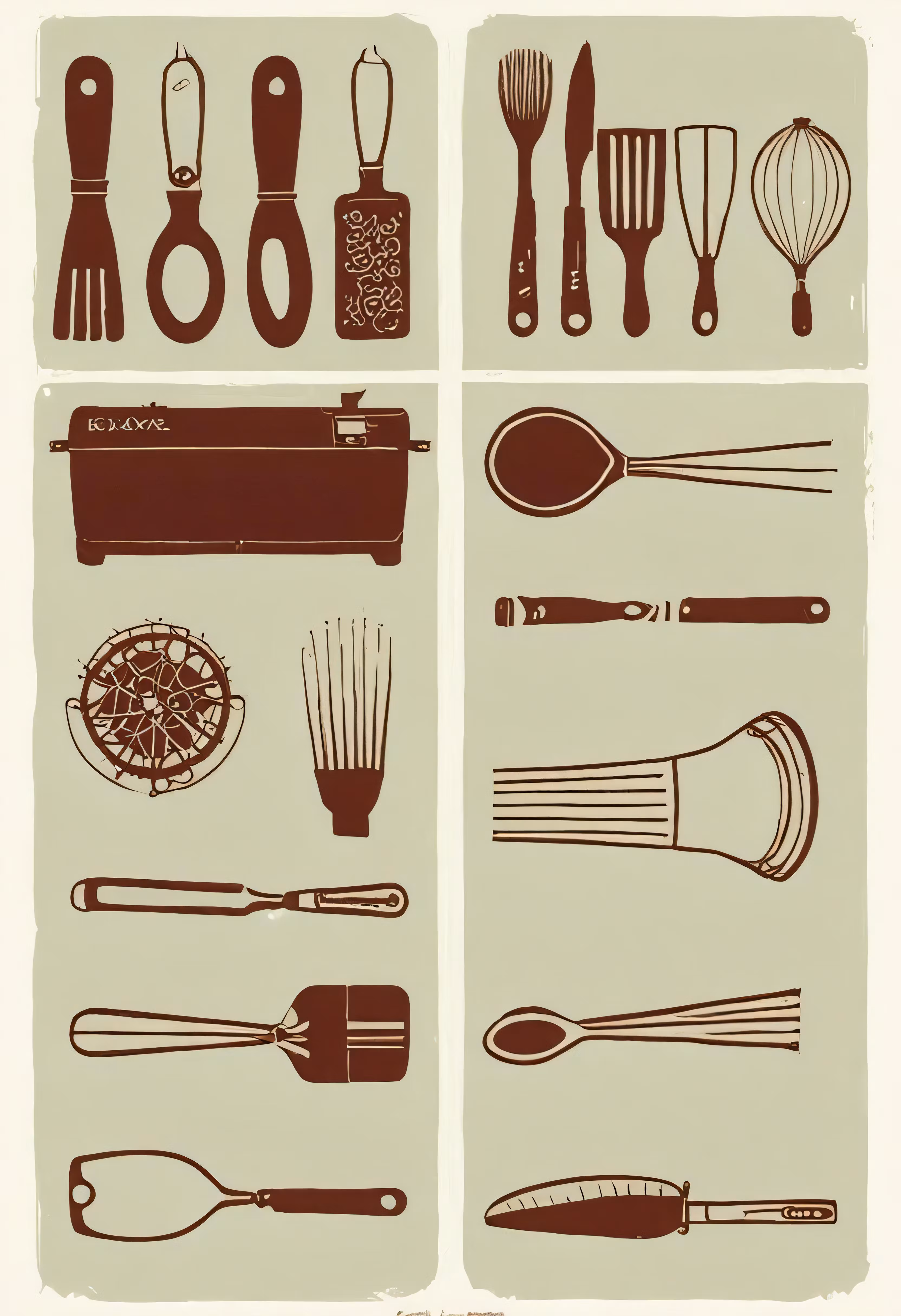 High resolution picture, free to use, a variety of utensils arranged into four squares