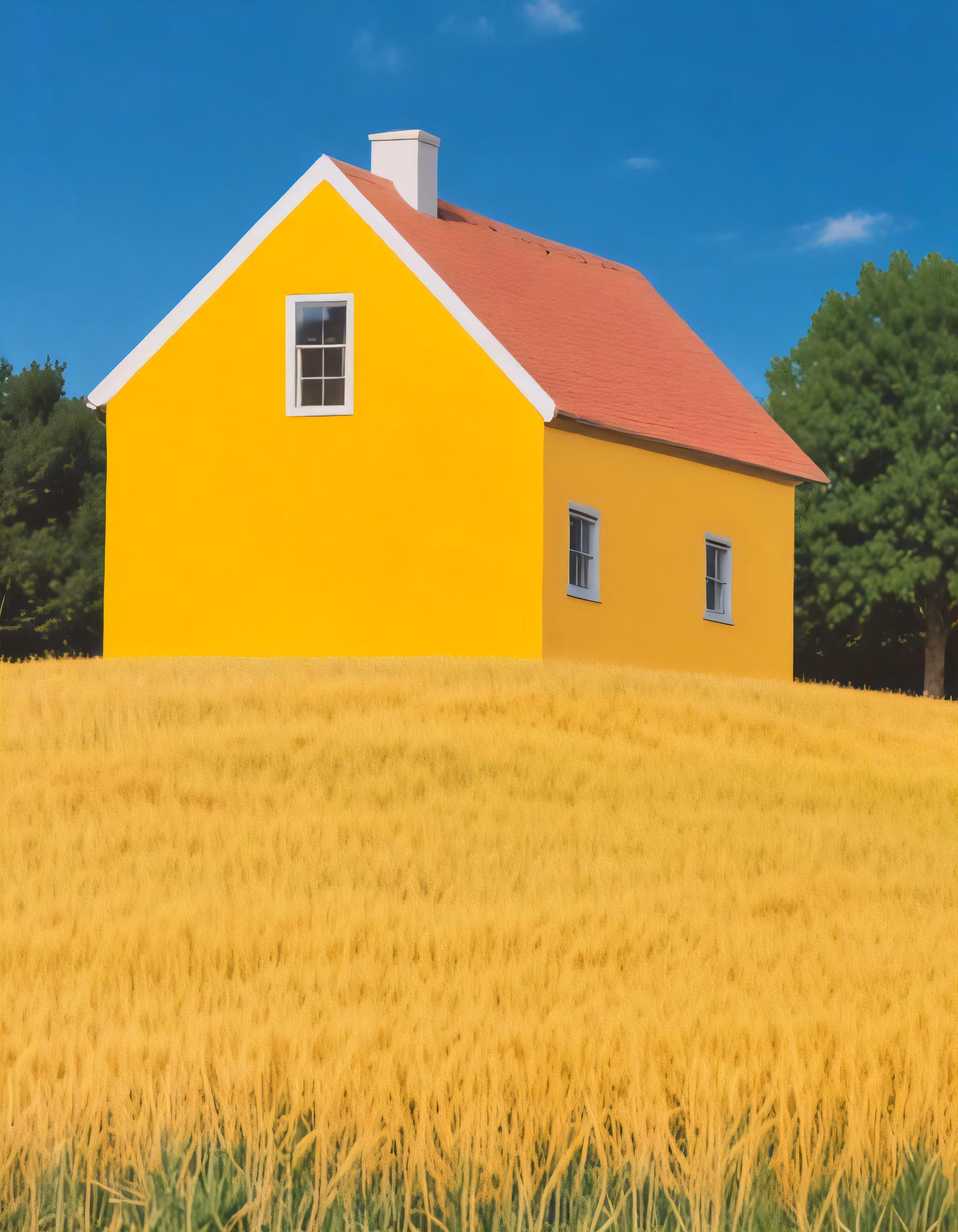 High resolution picture, free to use, a very cute yellow house near some pretty trees