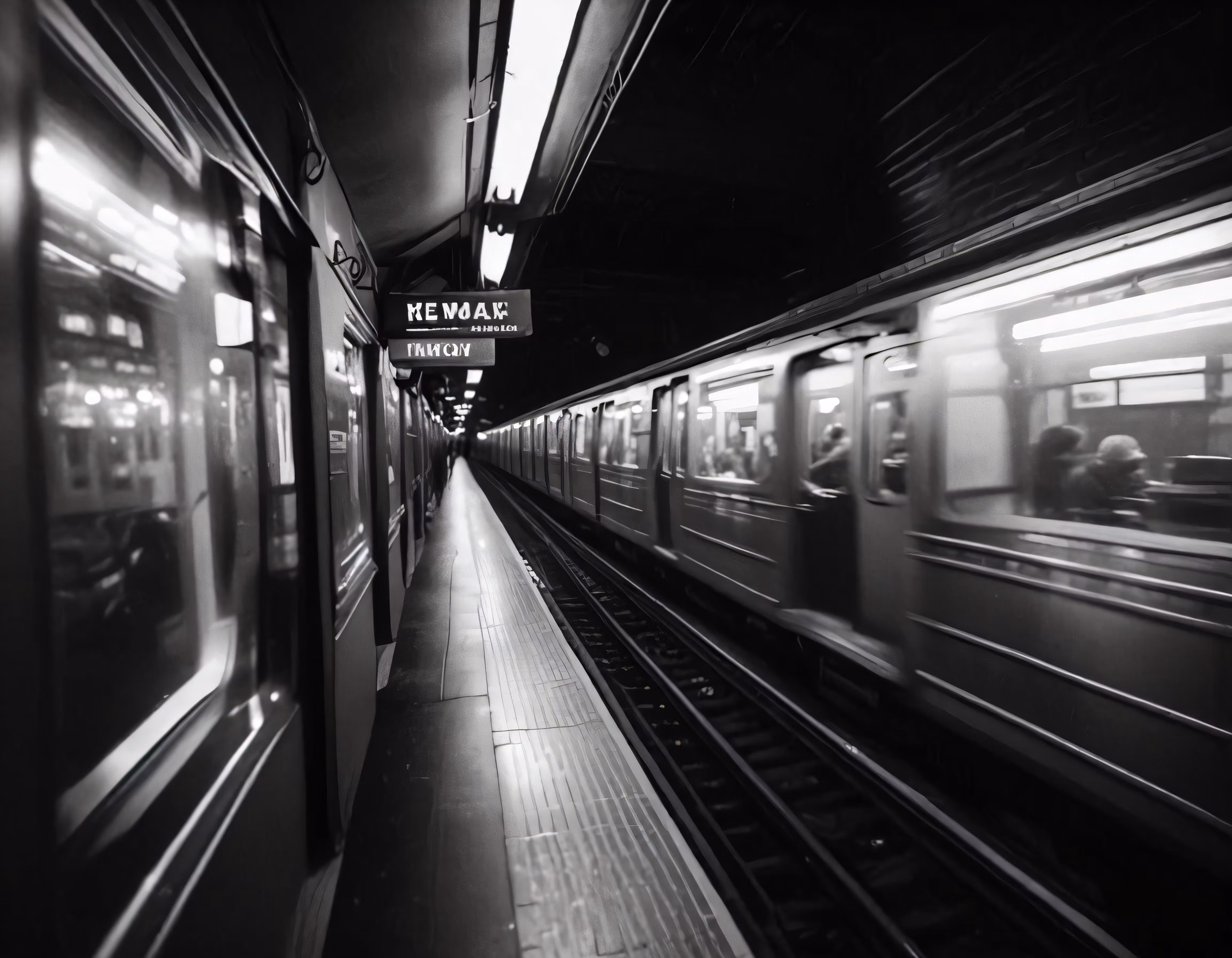 High resolution picture, free to use, a very dark subway platform at night with a train going by