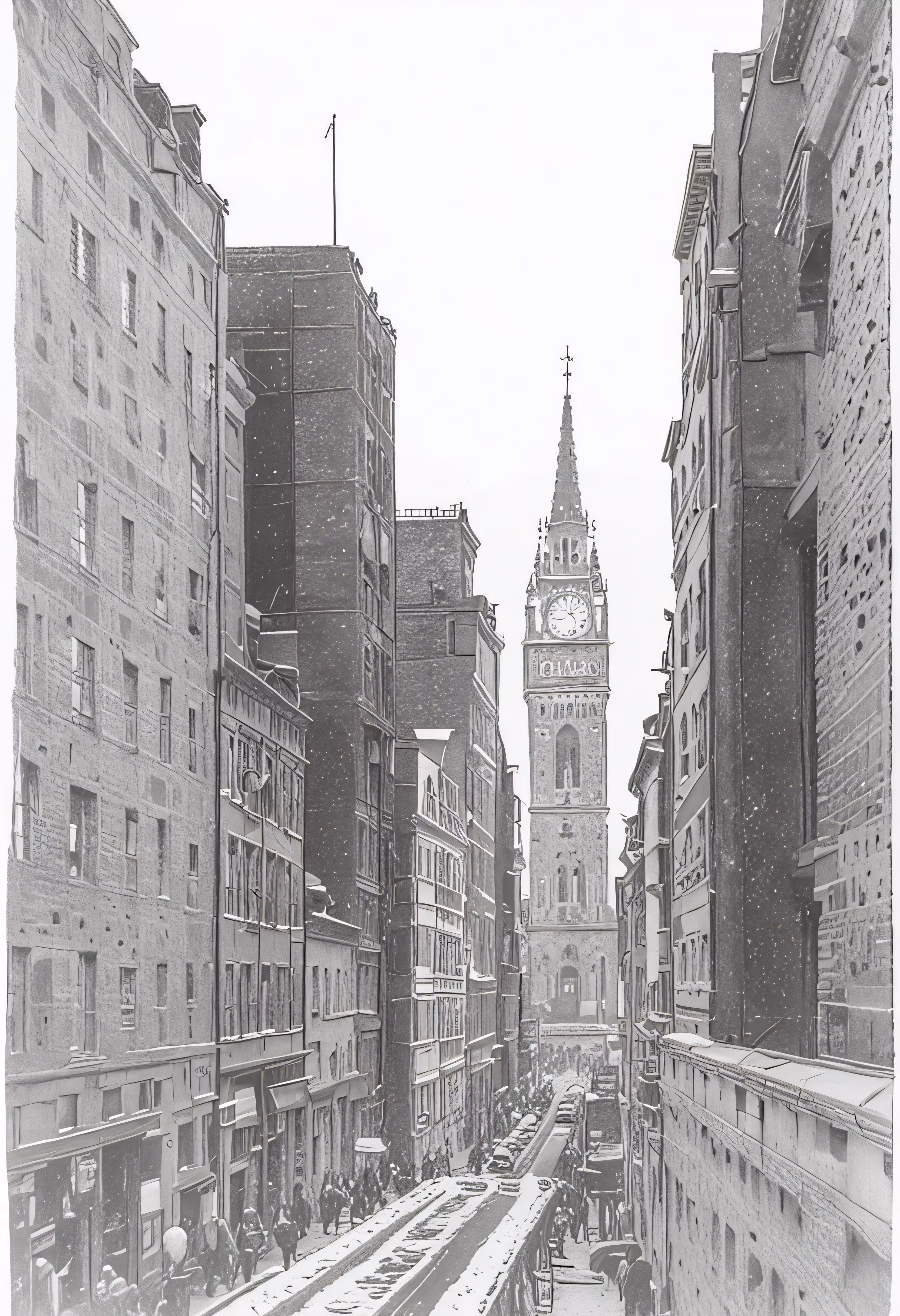 High resolution picture, free to use, a view of a snow covered city with a clock tower in the background