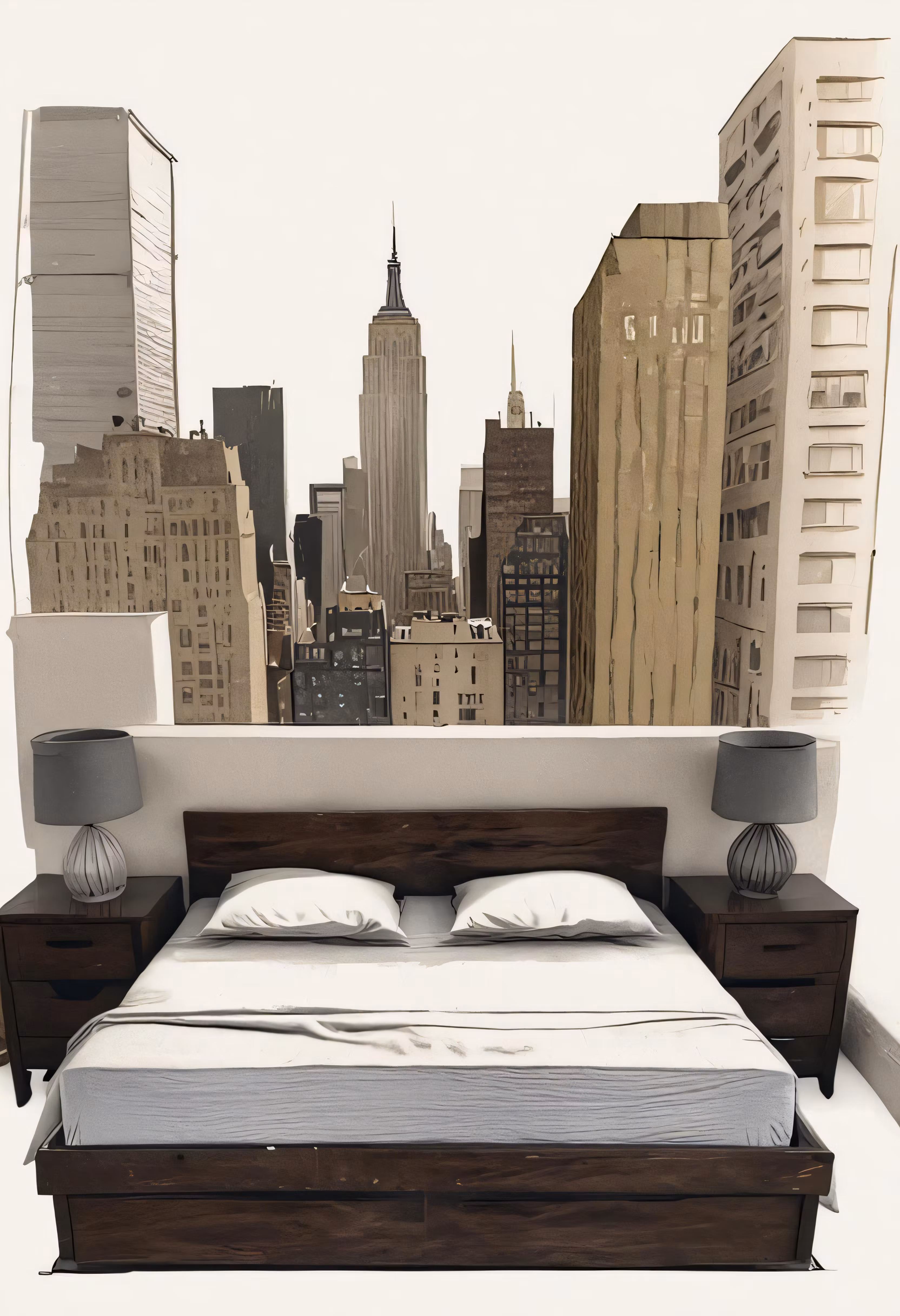 High resolution picture, free to use, a view of the bedroom features a wooden headboard and bedside table with two lamps on them