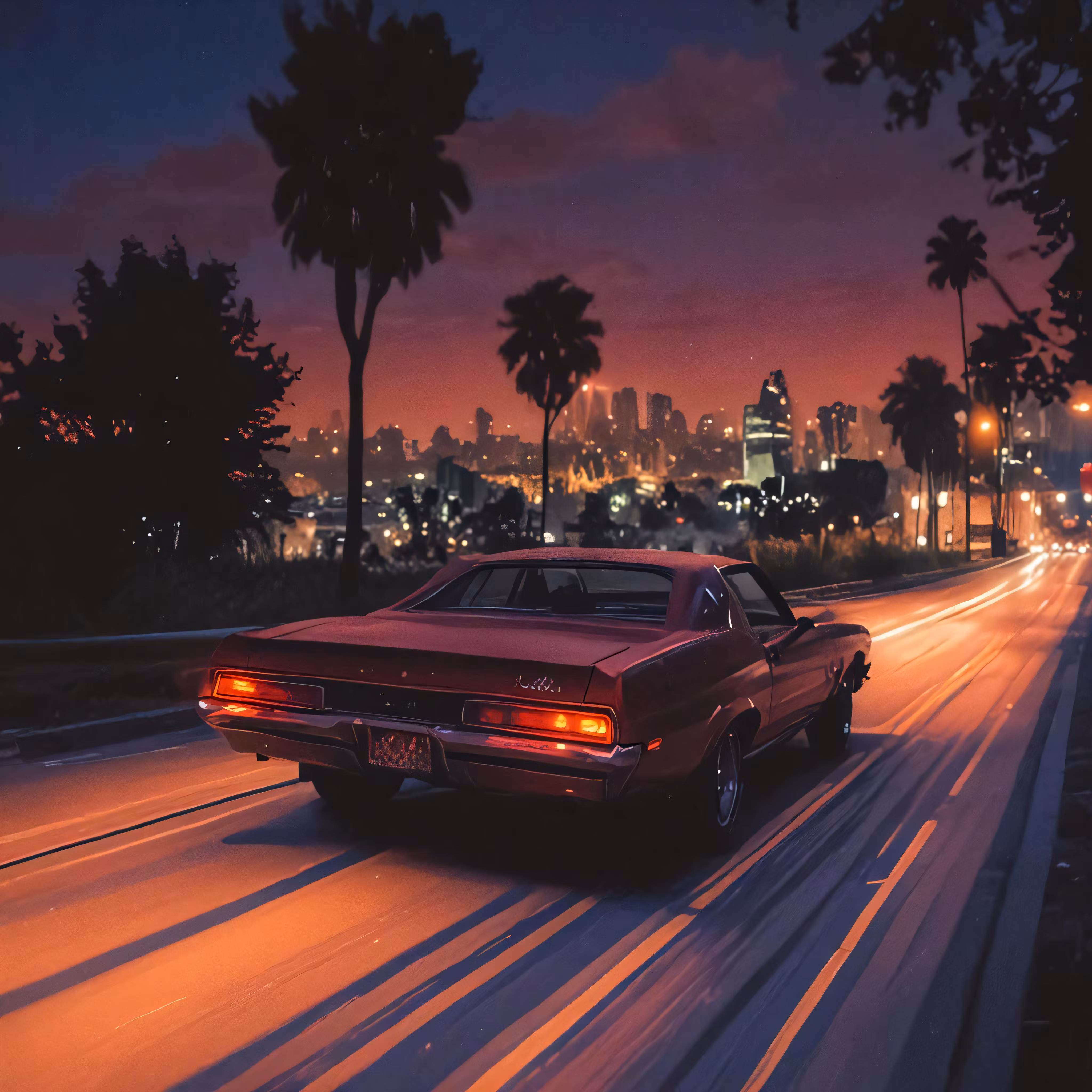 High resolution picture, free to use, a vintage car driving down the road at night with palm trees