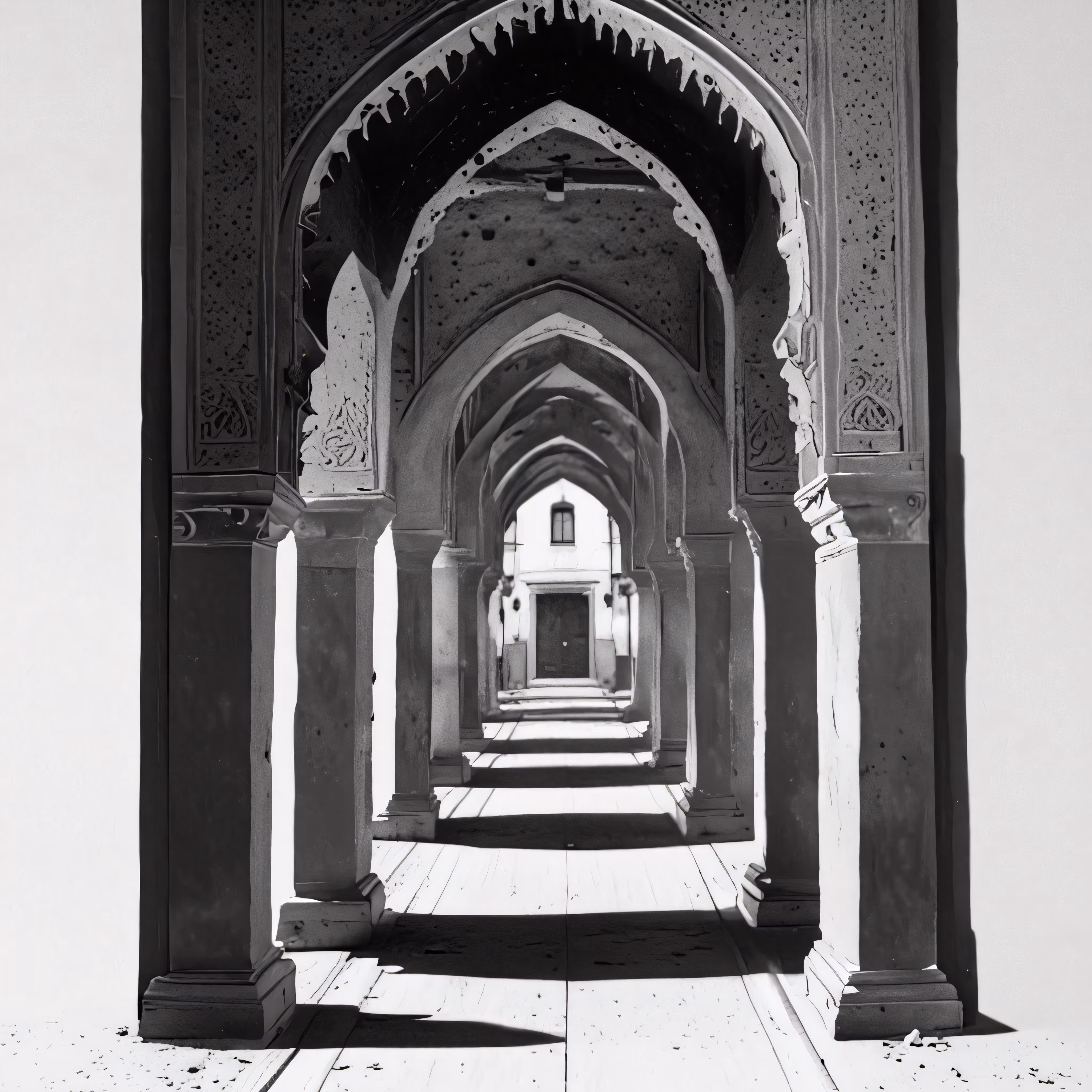 High resolution picture, free to use, a walkway lined with pillars and arches on a sunny day