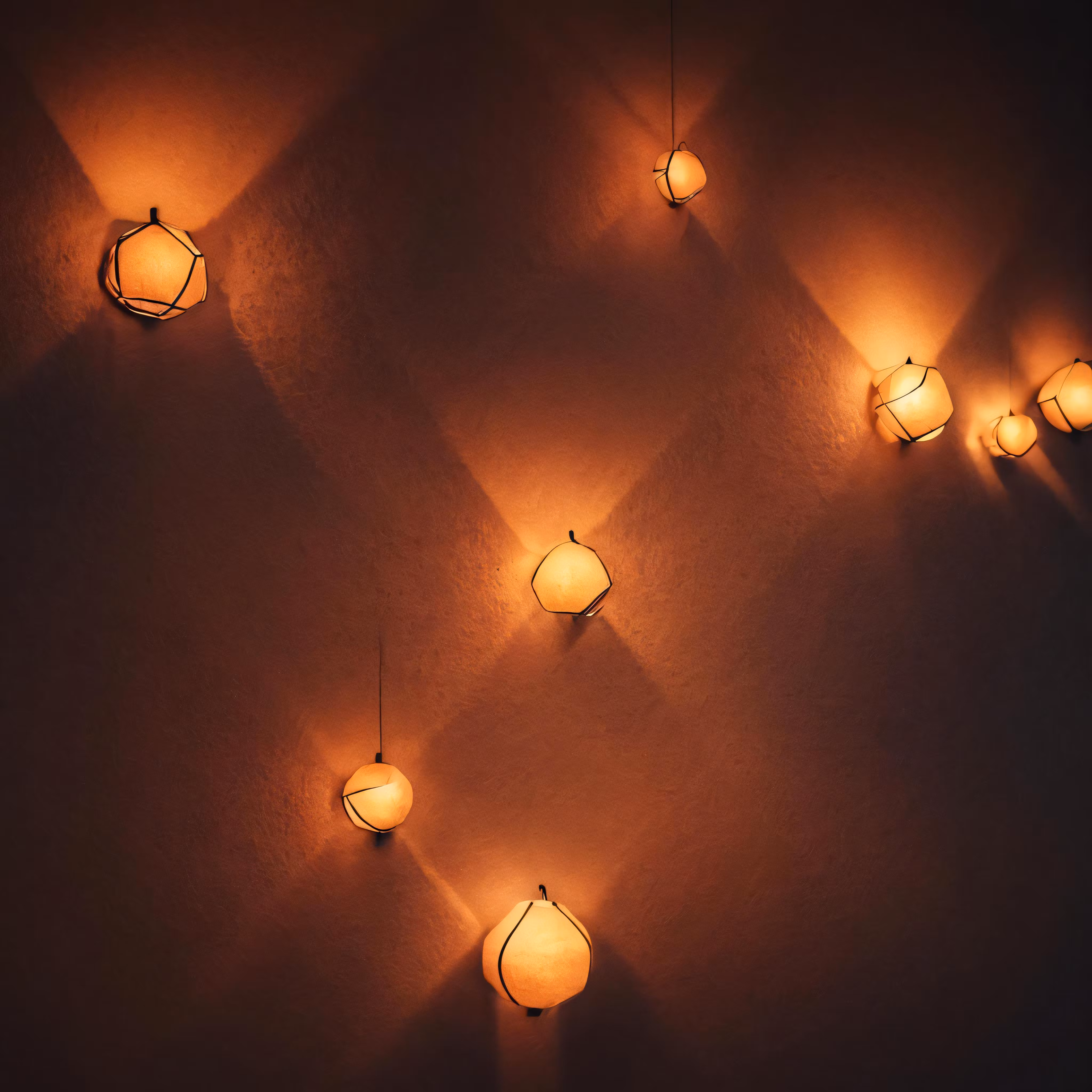 High resolution picture, free to use, a wall with five lamps that are lit up