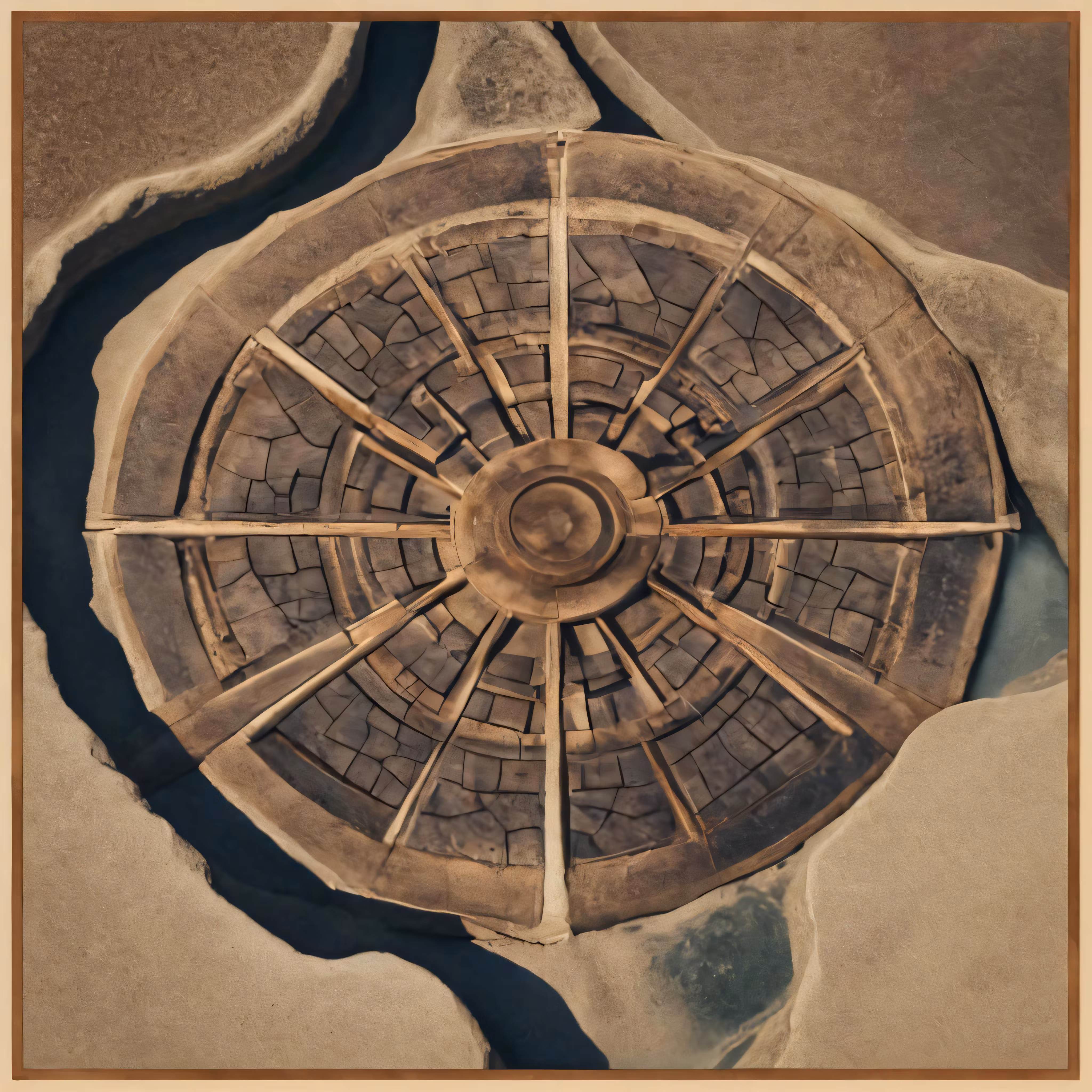 High resolution picture, free to use, a water fountain surrounded by sandy ground and rocks