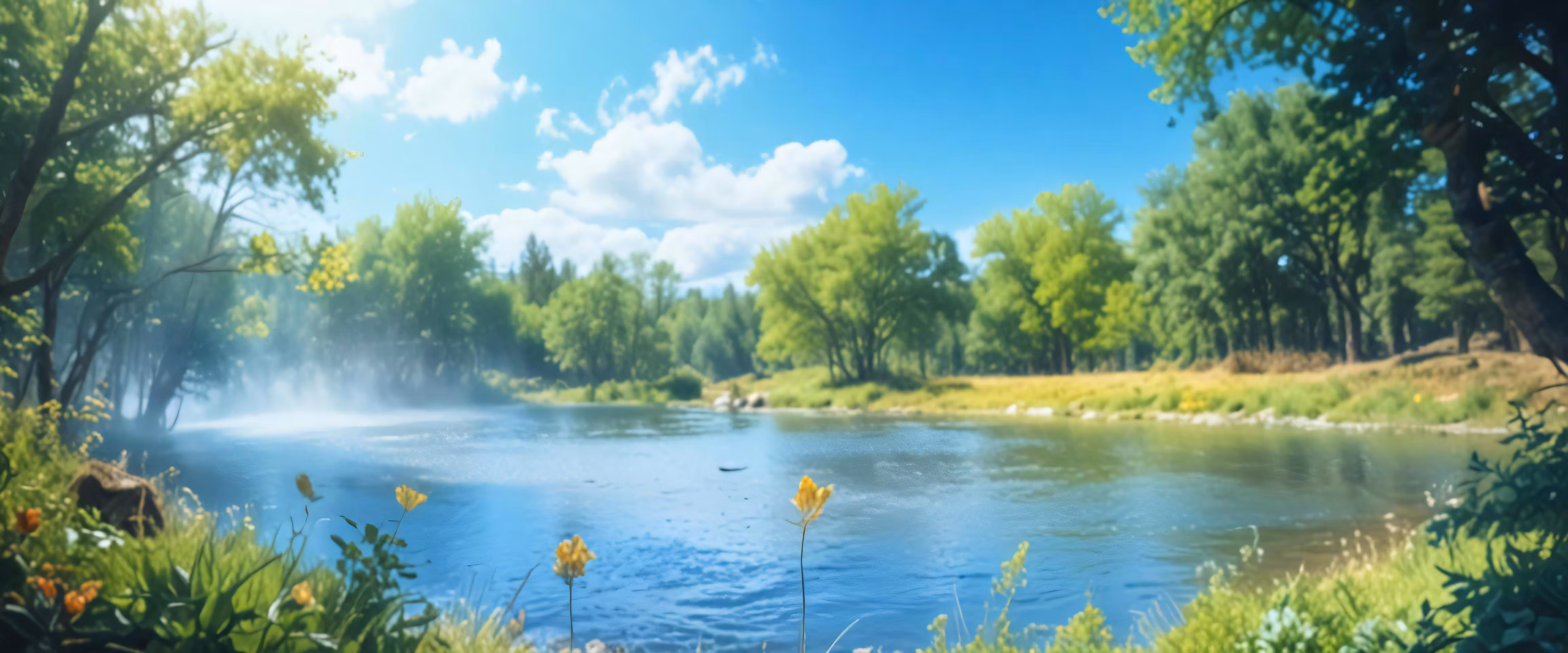 High resolution picture, free to use, a water stream flowing between lush green trees