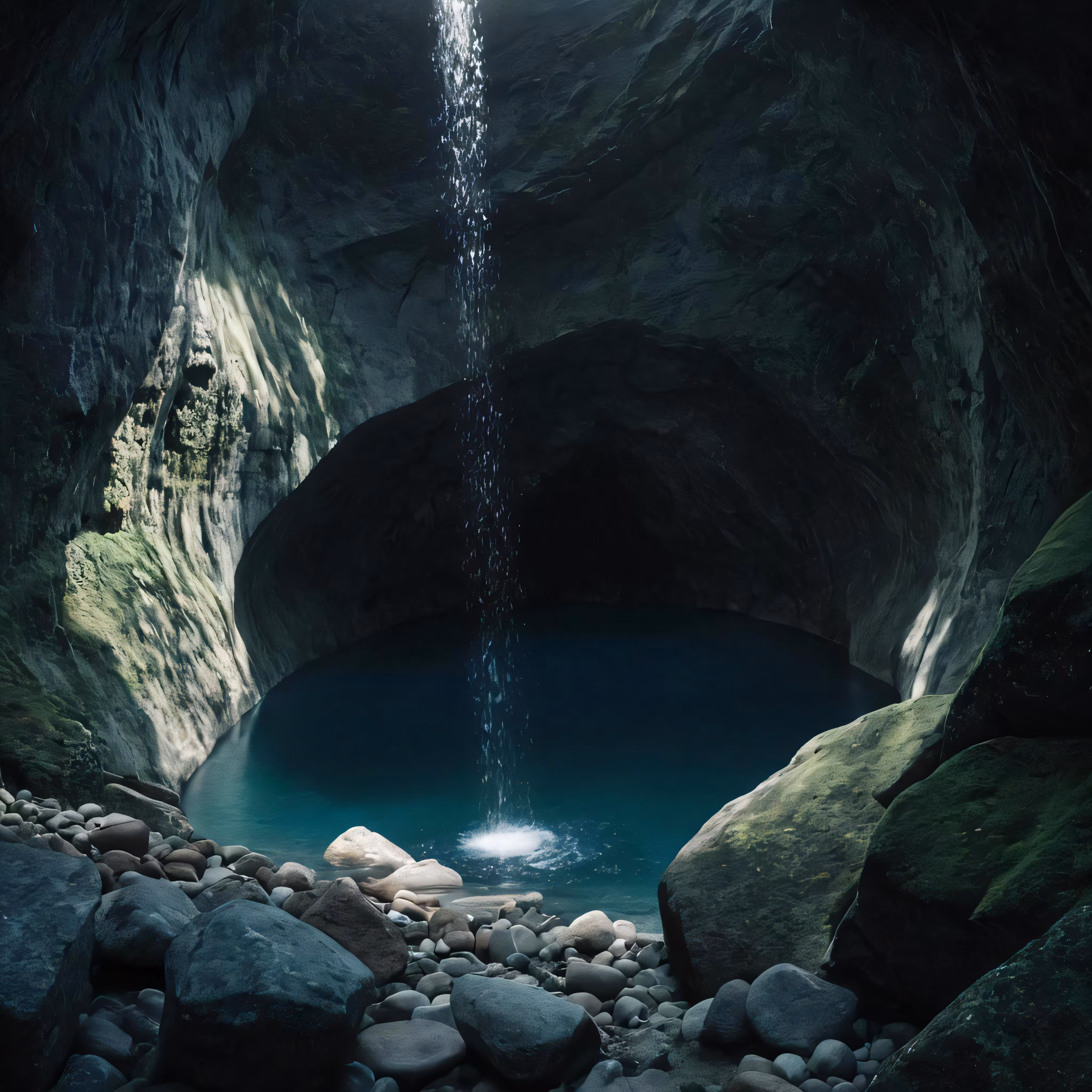 High resolution picture, free to use, a waterfall falling into a cave filled with green water
