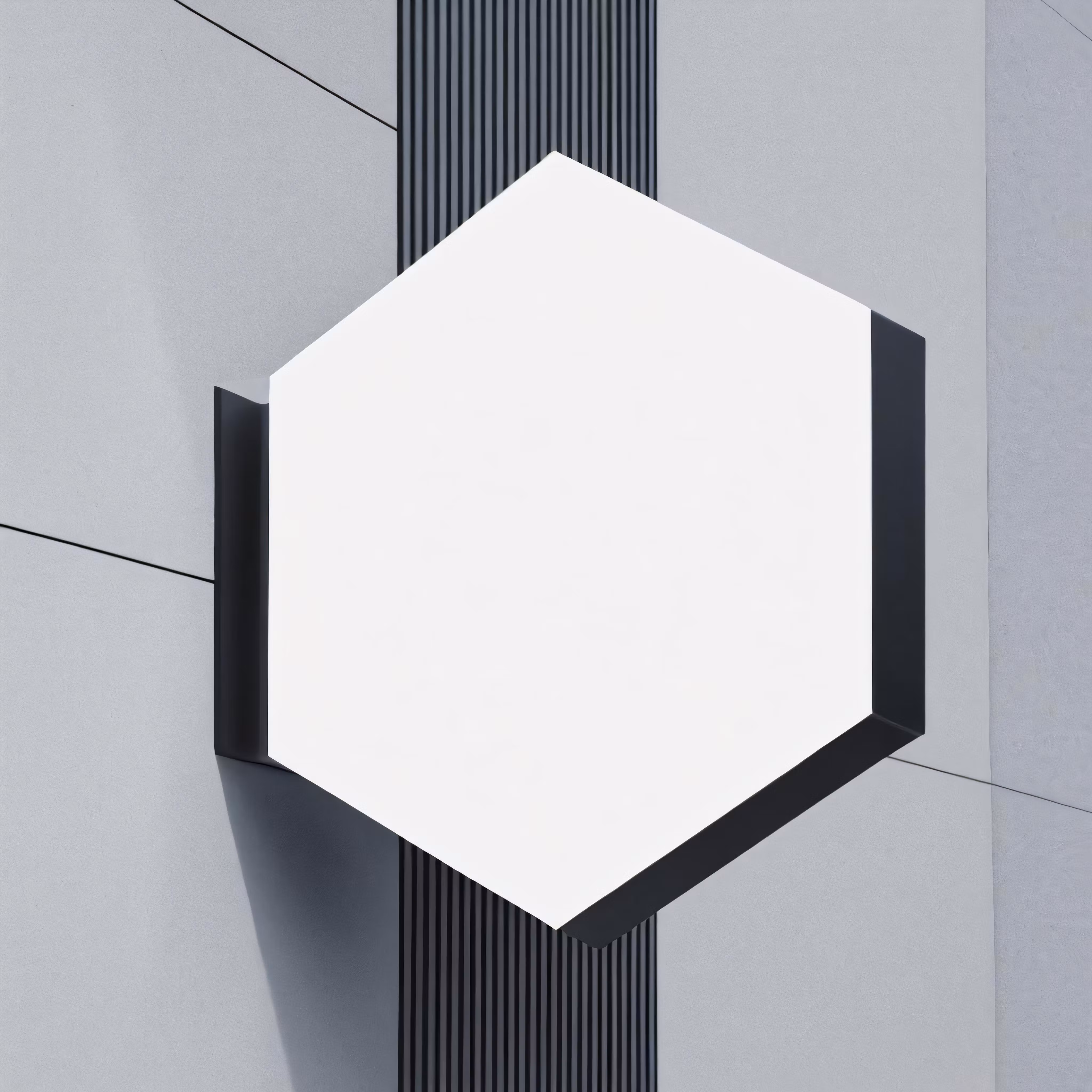 High resolution picture, free to use, a white and black hexagon shaped object hangs on the side of a building