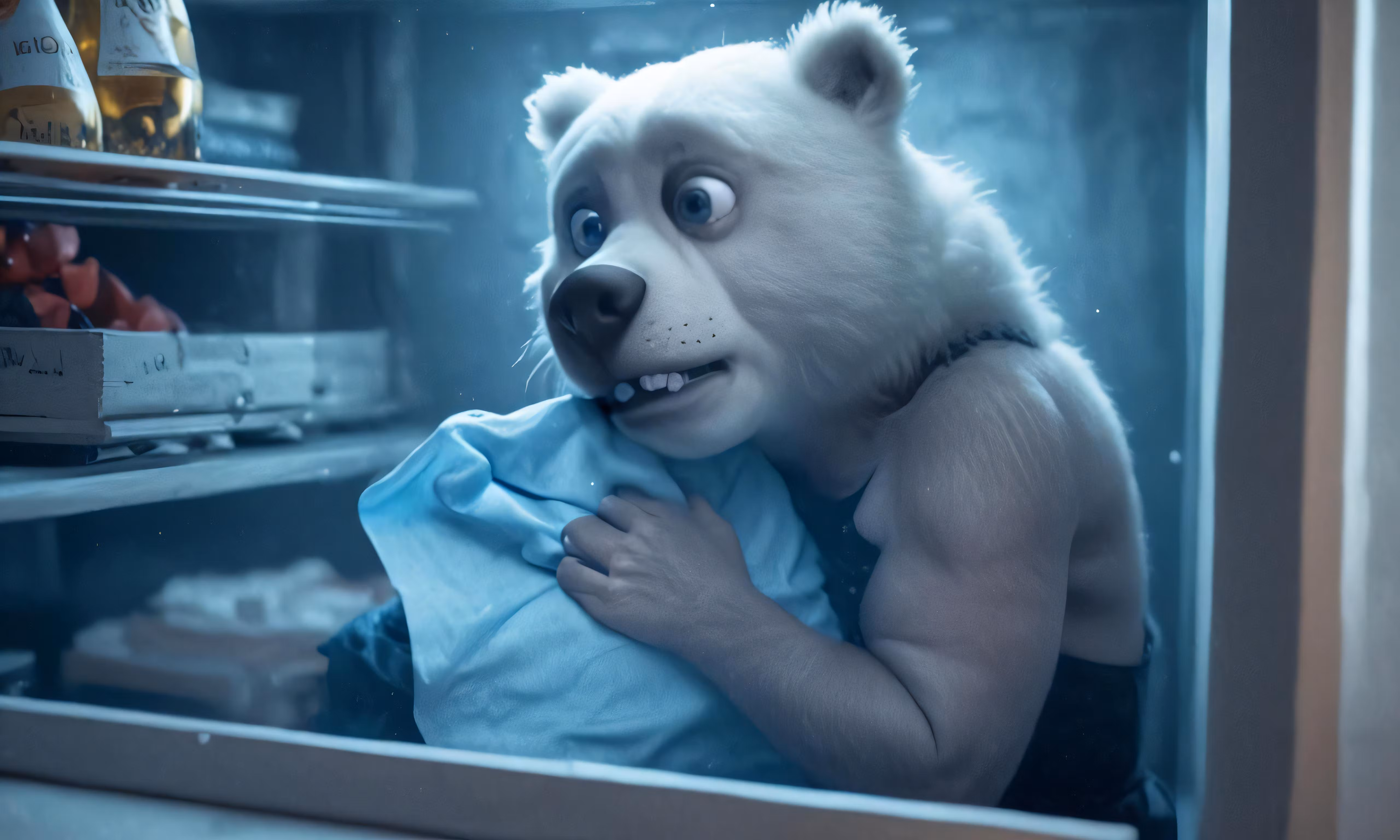 High resolution picture, free to use, a white bear is holding a towel in front of a refrigerator