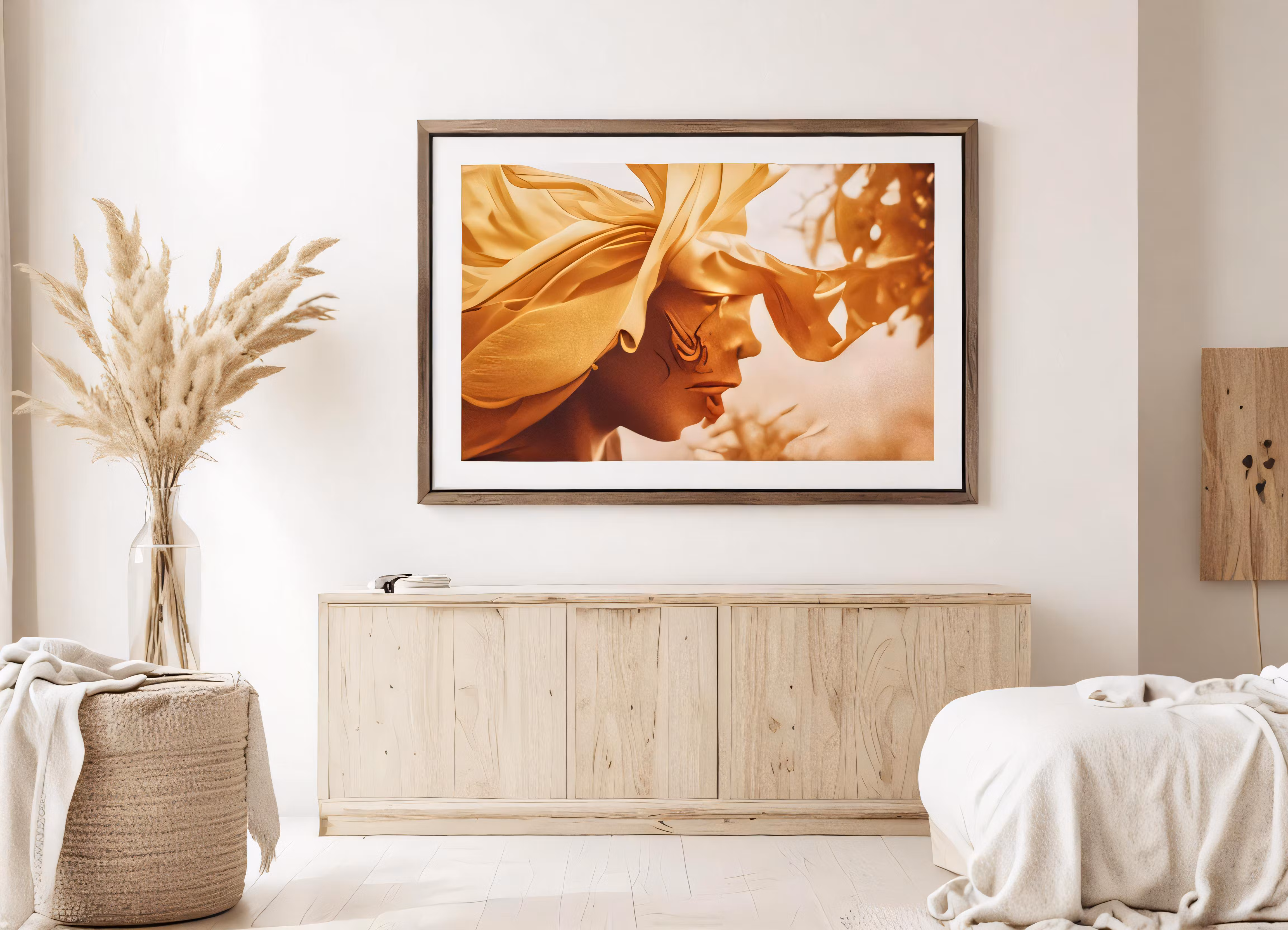 High resolution picture, free to use, a white bedroom with a painting and furniture