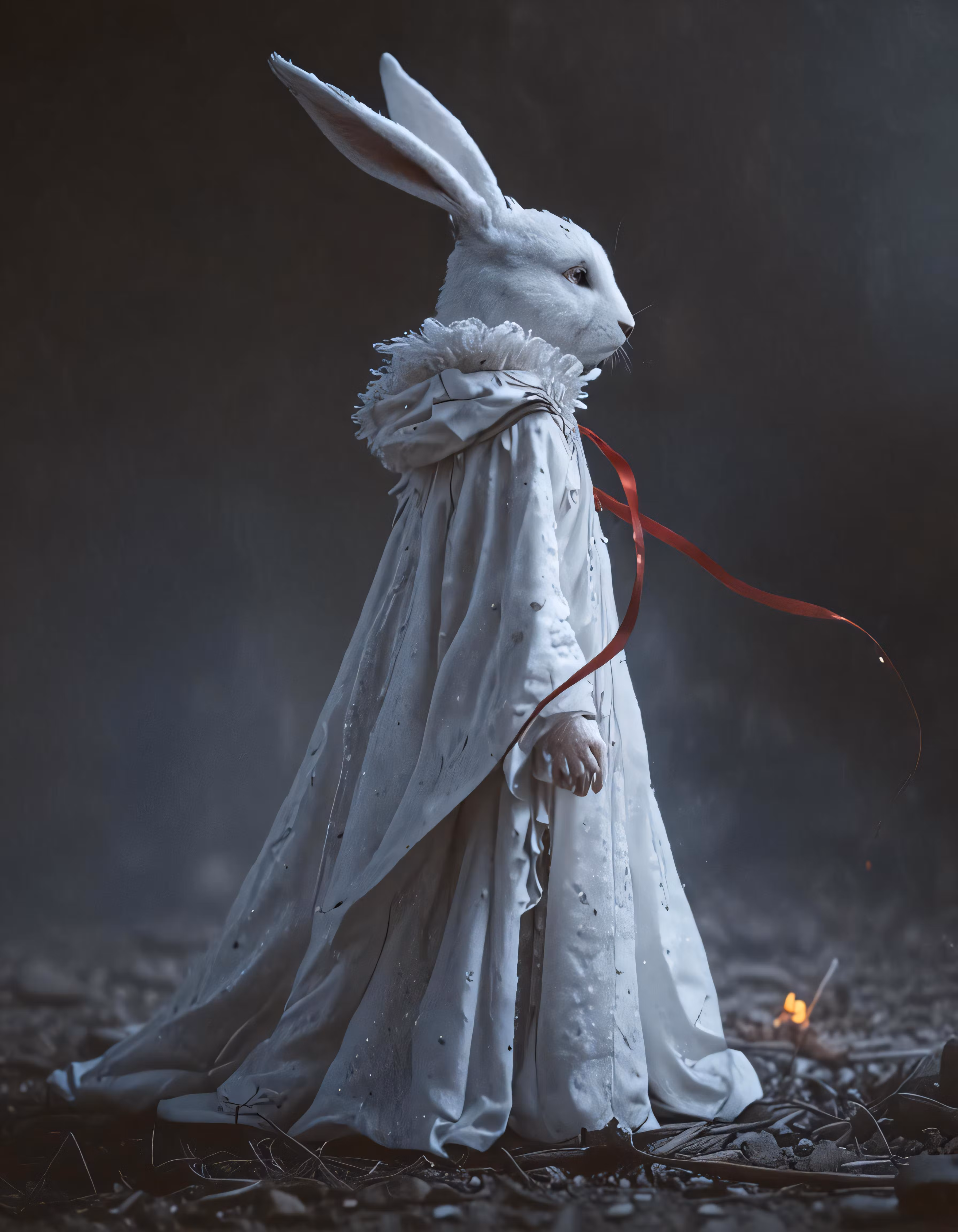 High resolution picture, free to use, a white bunny dressed up in a dress with red strings and a long cloak