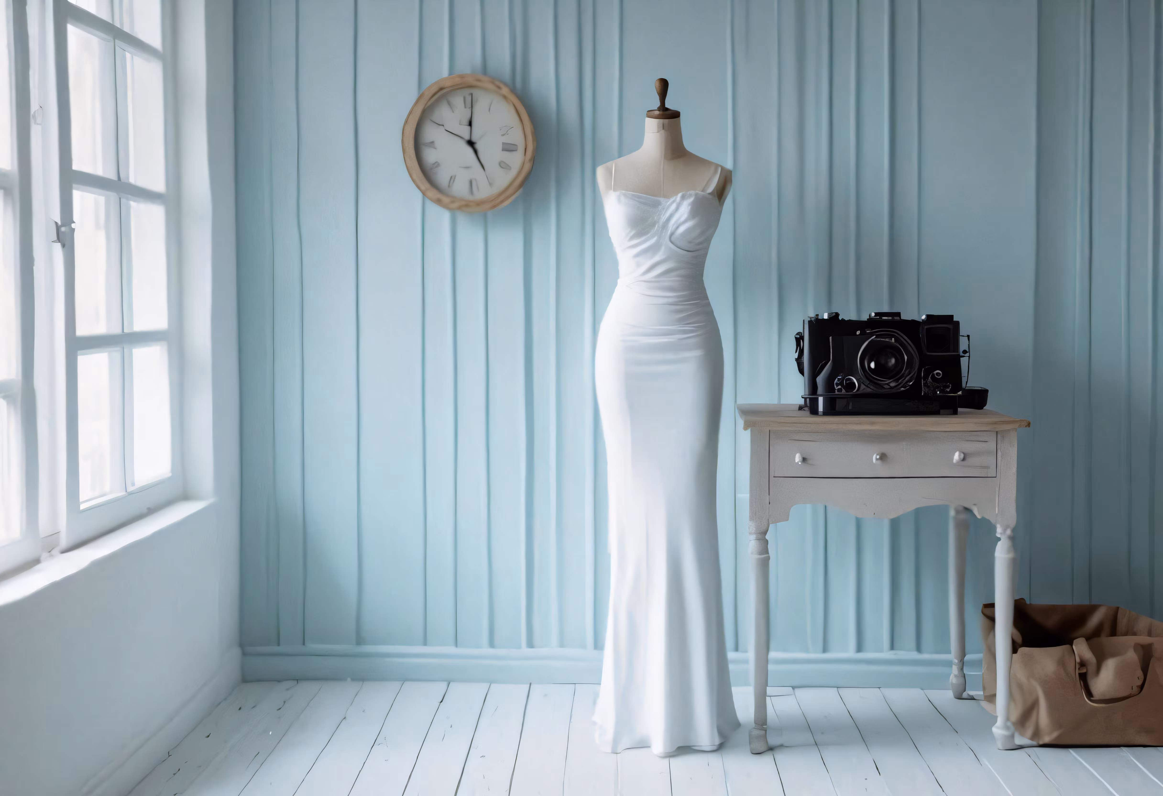 High resolution picture, free to use, a white dress on a mannequin next to a table with a clock and purse