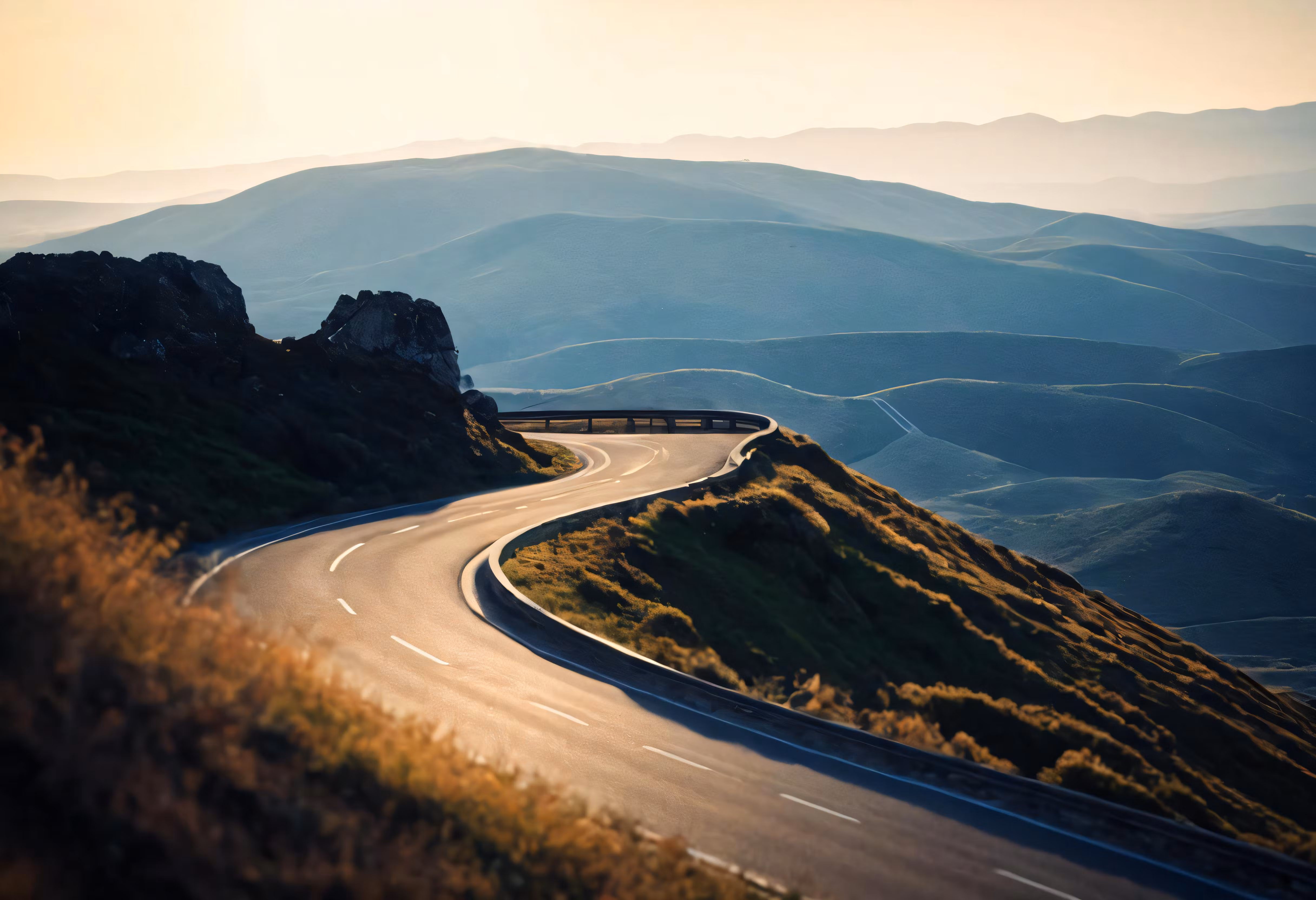 High resolution picture, free to use, a winding and winding mountain road is pictured with bright sunshine