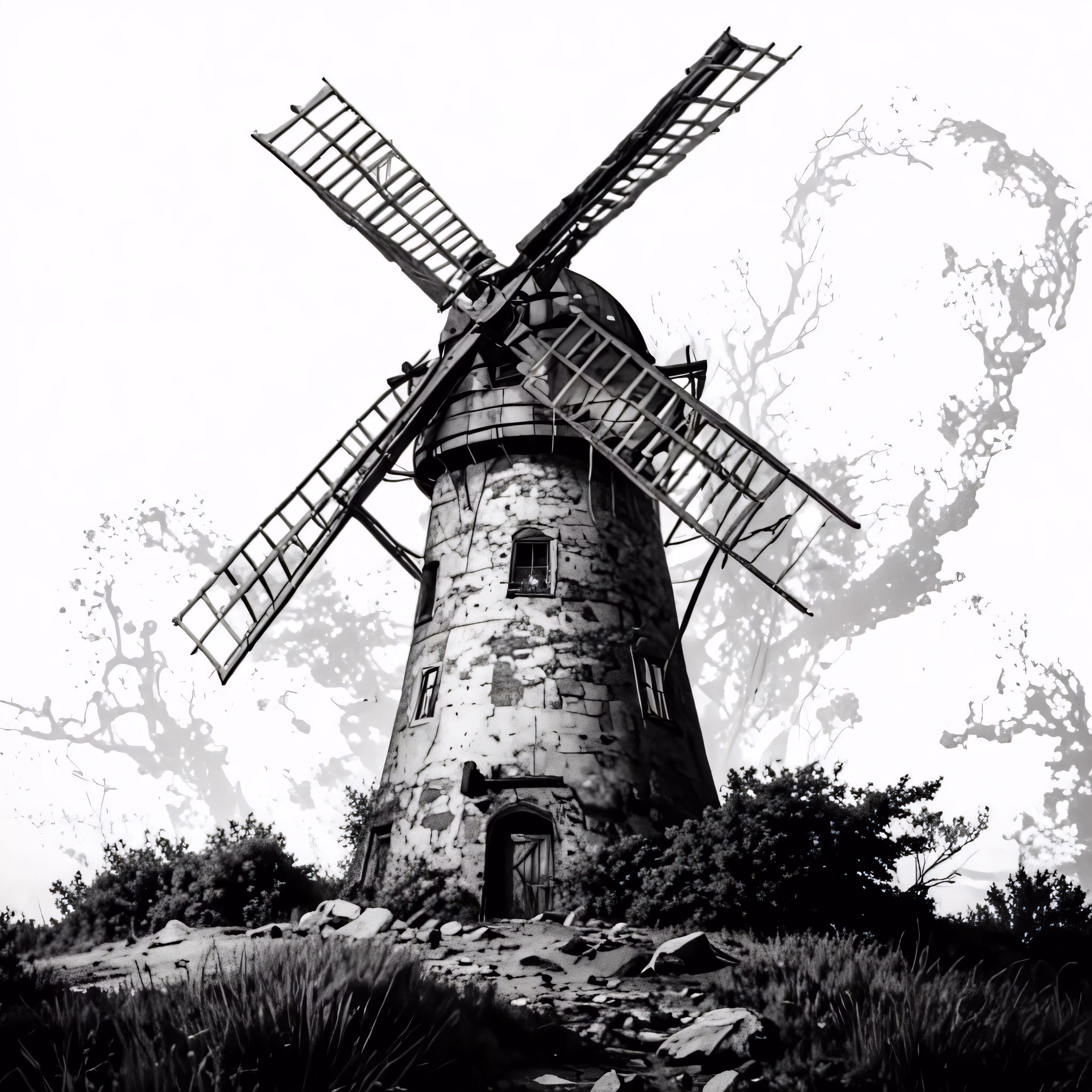 High resolution picture, free to use, a windmill on a hill near a small tree